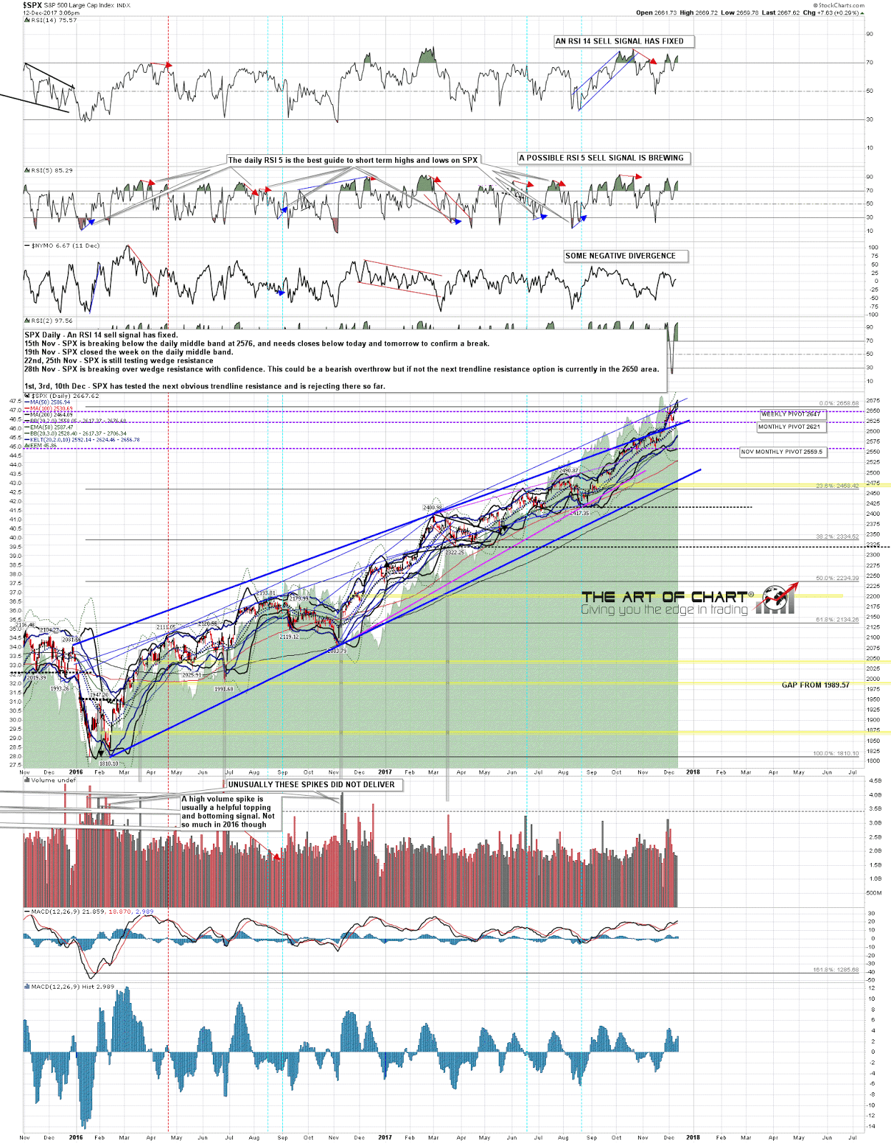 On the SPX daily chart, I’ve been showing the possible bigger picture resistance trendline being tested, and that’s still being tested, on quite a bit of negative RSI divergence. Significantly higher targets on RSI require at least a temporary break of that trendline. SPX daily chart: