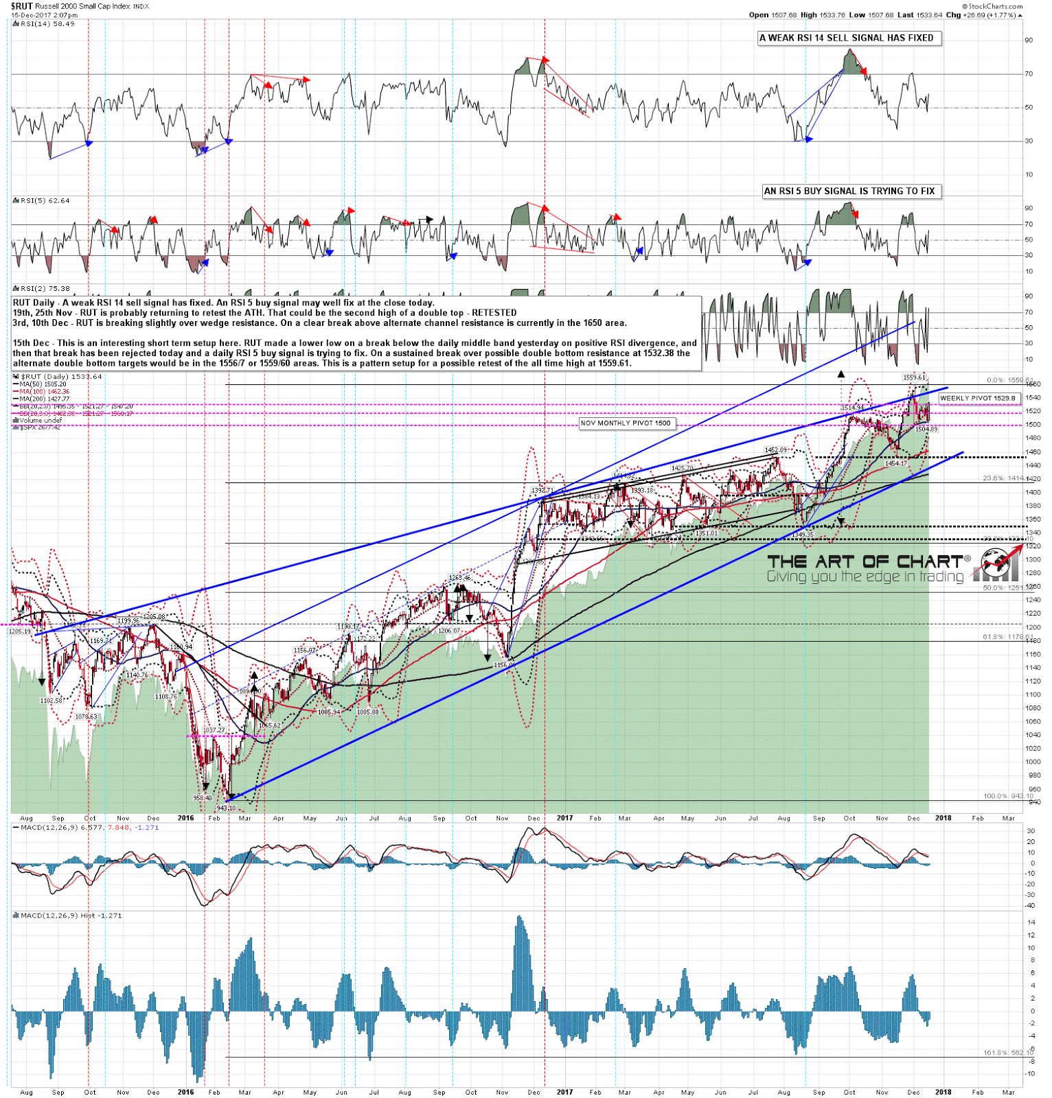 What I’ve been looking at since I did the video is the very interesting setup on RUT here, as it had barely moved all week before moving down yesterday to break the last low and the daily middle band. That lower low was on positive RSI divergence, and at the close today, RUT may well fix a daily RSI 5 buy signal, with a full rejection candle today against yesterday’s decline and a nice little double bottom set up that on a sustained break over 1533 looks for in effect a full retest of the all-time high. If that delivers then we may well see NQ make my resistance trendline in the 6530 area and a test on ES of 2700 before the December high, which we are expecting sometime next week. RUT daily chart: