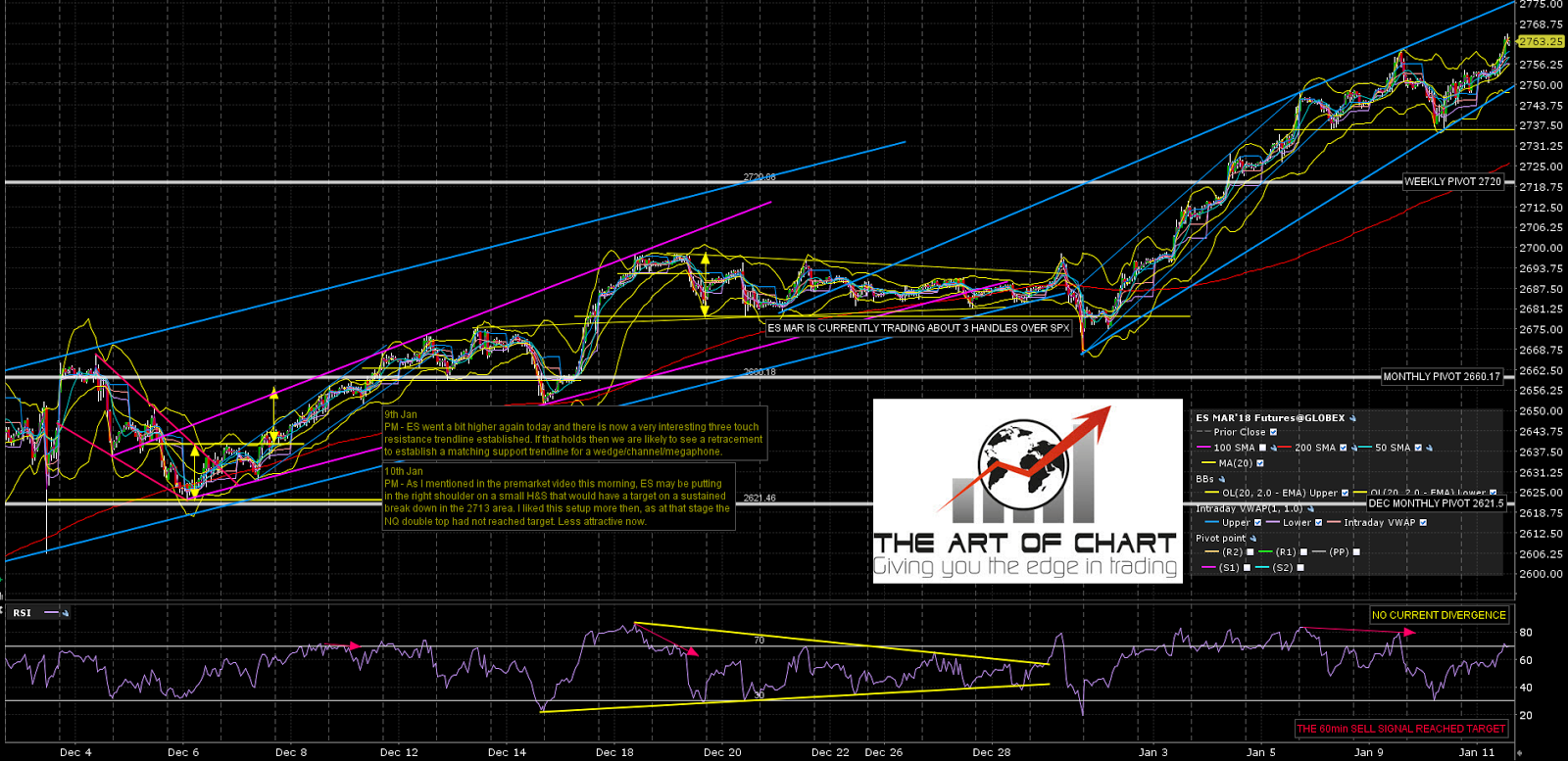 A decent three-touch resistance trendline was established on ES on Monday, and I was looking for yesterday’s retracement to establish a corresponding support trendline. That is now done and I have a working rising wedge on ES with wedge resistance now at 2775 if ES can clear Stan’s resistance in the 2775 area. NQ and TF both also looking interesting and I cover all three in the video.