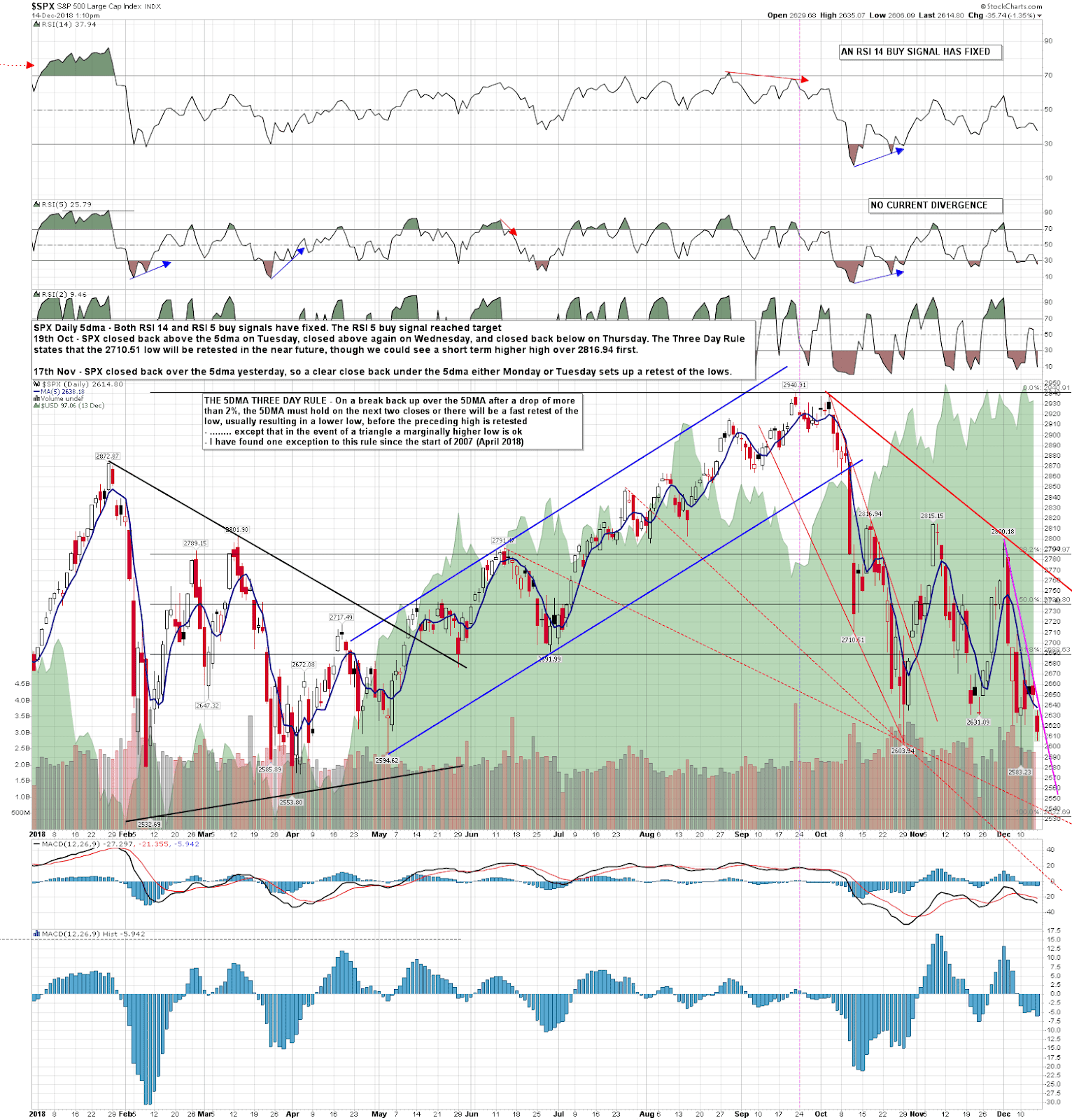SPX closed ten handles or so over the 5dma yesterday, so SPX is back on the Three Day Rule. If SPX should close back below the 5dma today or Monday then we should expect a retest of the last low at 2583.23 in the near future. At the moment the 5dma is at 2638 and SPX looks likely to close the day below it.