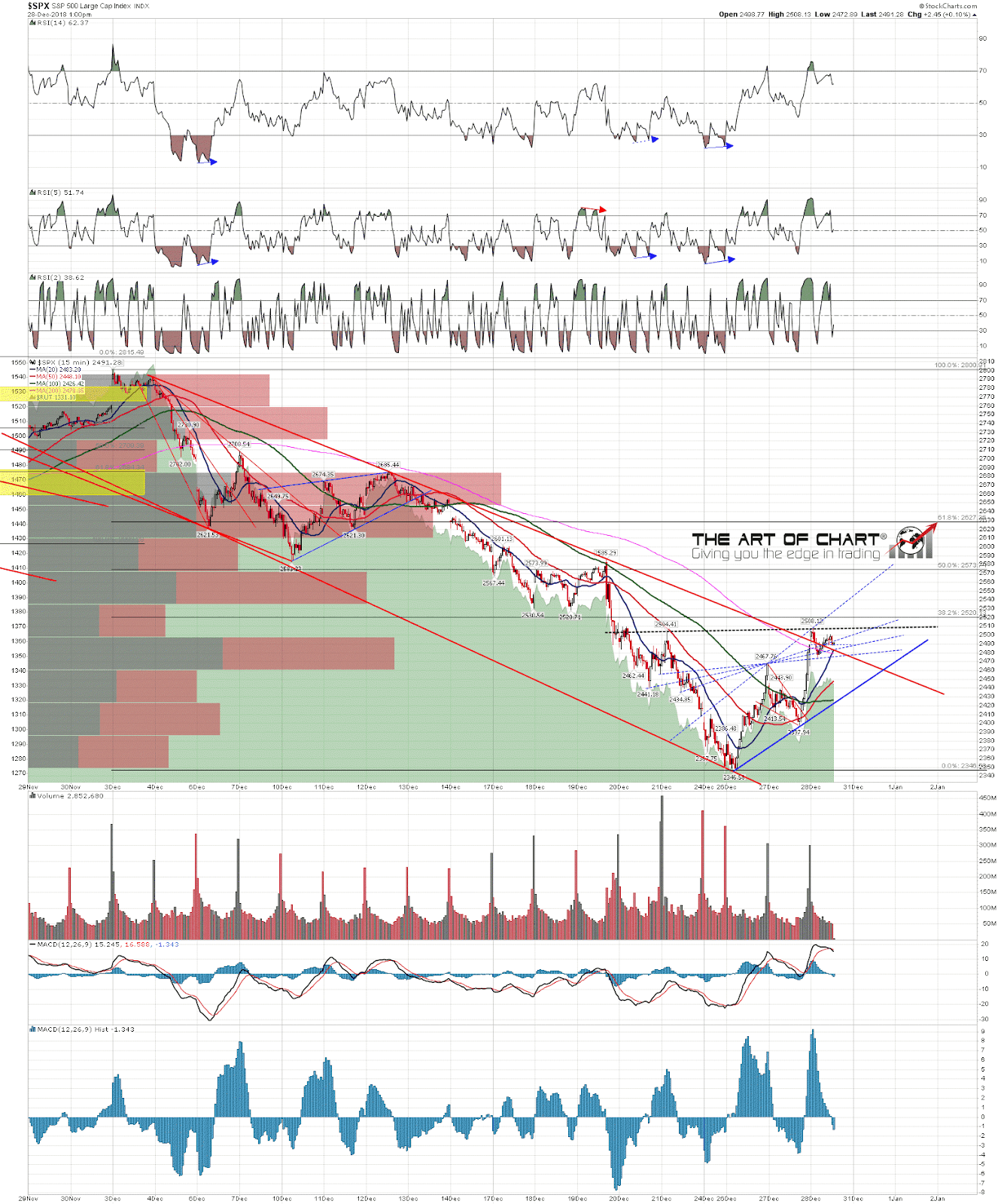 The short term pattern is unclear as yet but rising (likely bear flag) support is now in the 2415-20 area, with closer support at the 50 hour MA now at 2472. The 5dma is currently at 2444 and this is day three on the Three Day Rule, so a close below there today would be very bearish, but doesn’t seem that likely at the moment. SPX 15min chart: