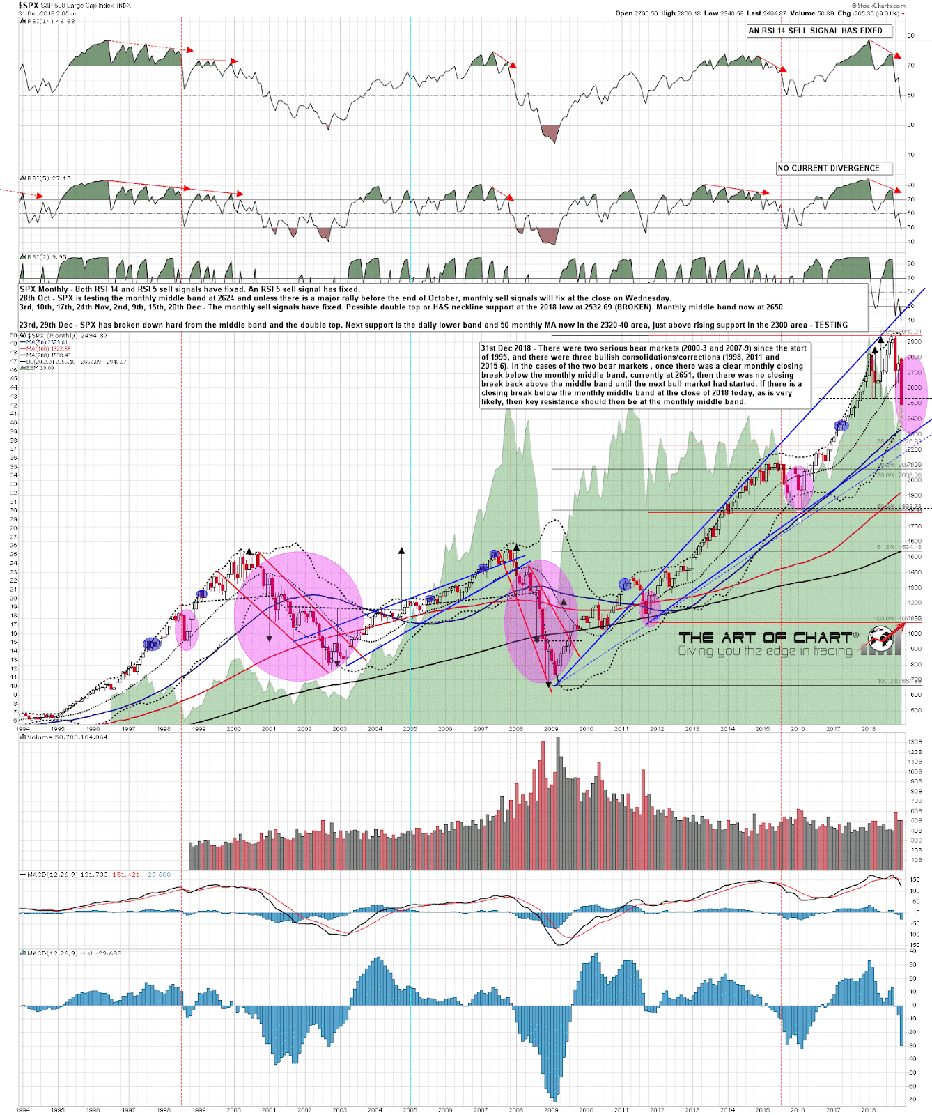 One of the things we were looking at was whether this current move down has been the first leg down in a bear market likely to extend well into 2019. Our feeling is that is most likely the case, but I was talking about the historical importance of the SPX monthly middle band in showing the nature of a move down. In the absence of something really unexpected SPX will break the monthly middle band, currently at 2651, with a lot of conviction at the close today and the last time that there was then a subsequent close significantly back over the middle band that didn’t then deliver a new all time high before a lower low was in 1957, so that is the level that I’ll be watching next year. If the monthly middle band is strong (monthly closing) resistance then we should see another leg down and we were talking about the targets for that. If SPX can deliver a closing break back over the monthly middle band then the odds will favor new all time highs, likely in 2019.