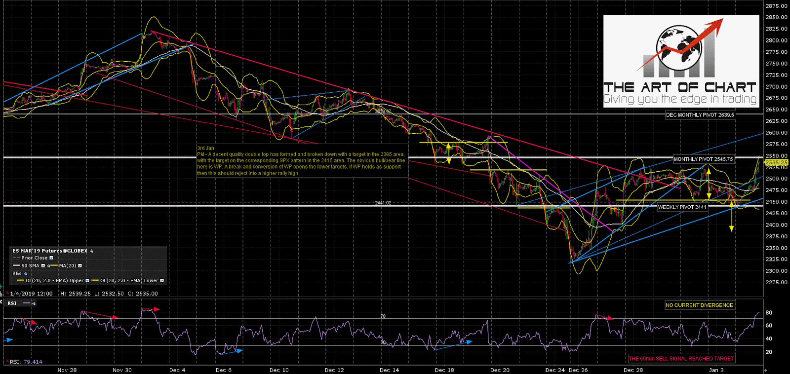 Stan and I did an educational webinar at theartofchart.net yesterday after the close on trading in bear markets, and we were talking then about ES/SPX being at an inflection point where on a conversion of the ES weekly pivot at 2441 to resistance ES would likely head down directly into the low retest, but if decent support was found there ES should reject into a retest of the rally high and ideally head for a target in the 2550 area. You can see a recording on that webinar on our January Free Webinars page.