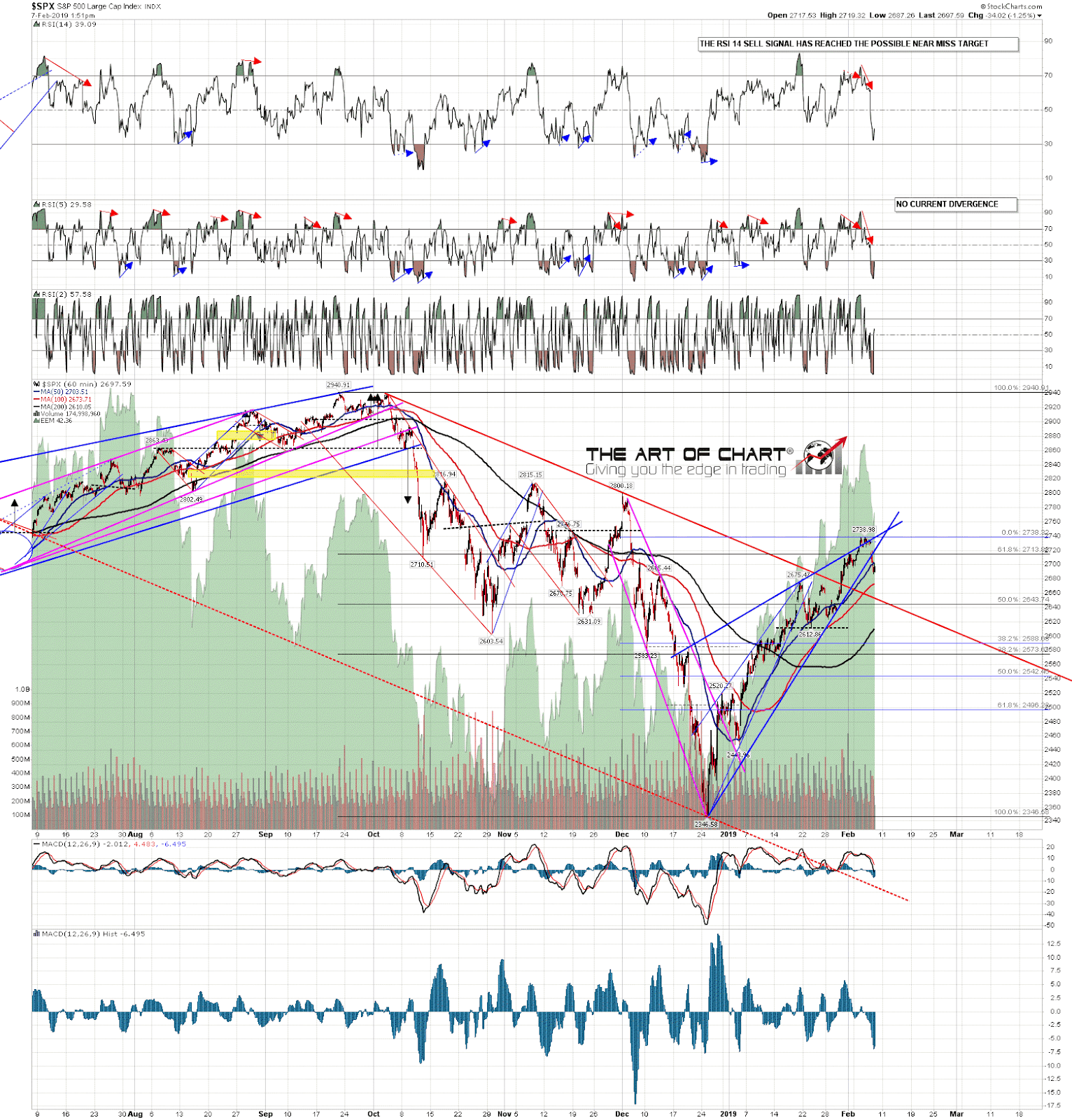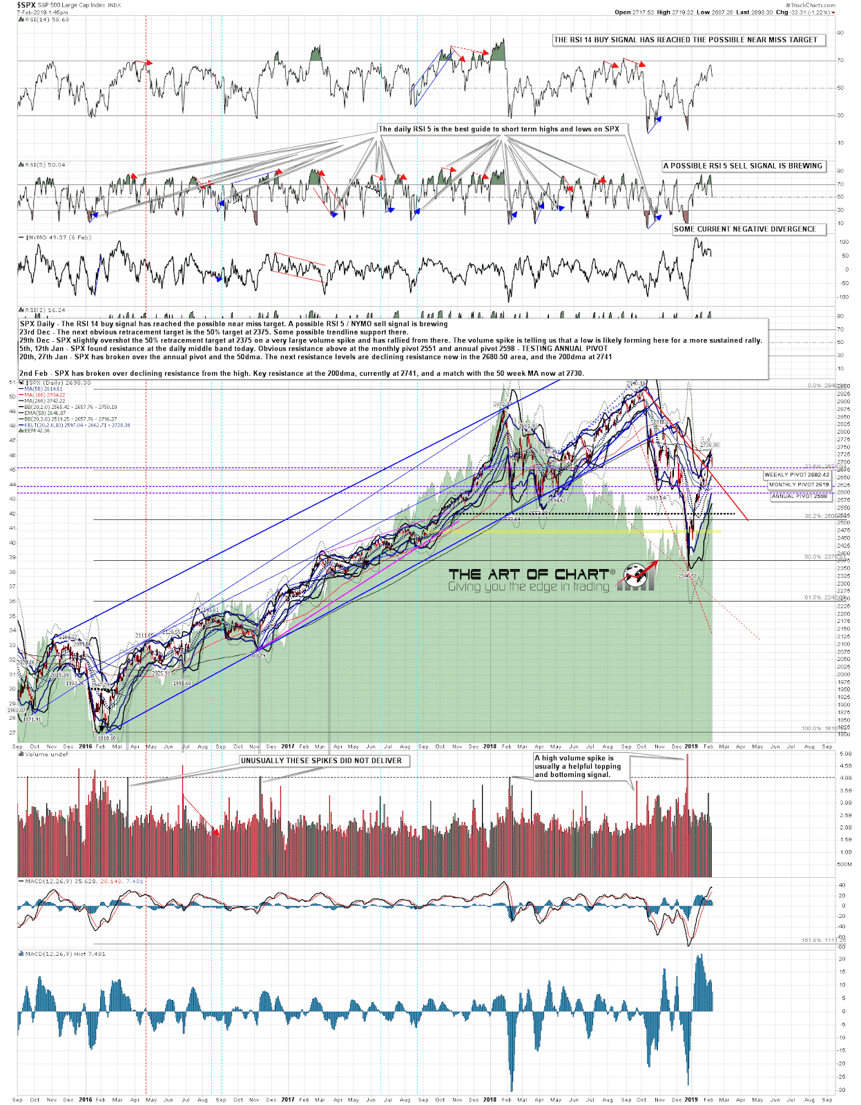 On the weekly chart, the key resistance level here is the weekly middle band in the 2730 area. You can see from the chart comments last week on the weekly and daily charts that I was flagging the weekly middle band and 200dma (2740 area) as the next big resistance area, and these are holding so far.