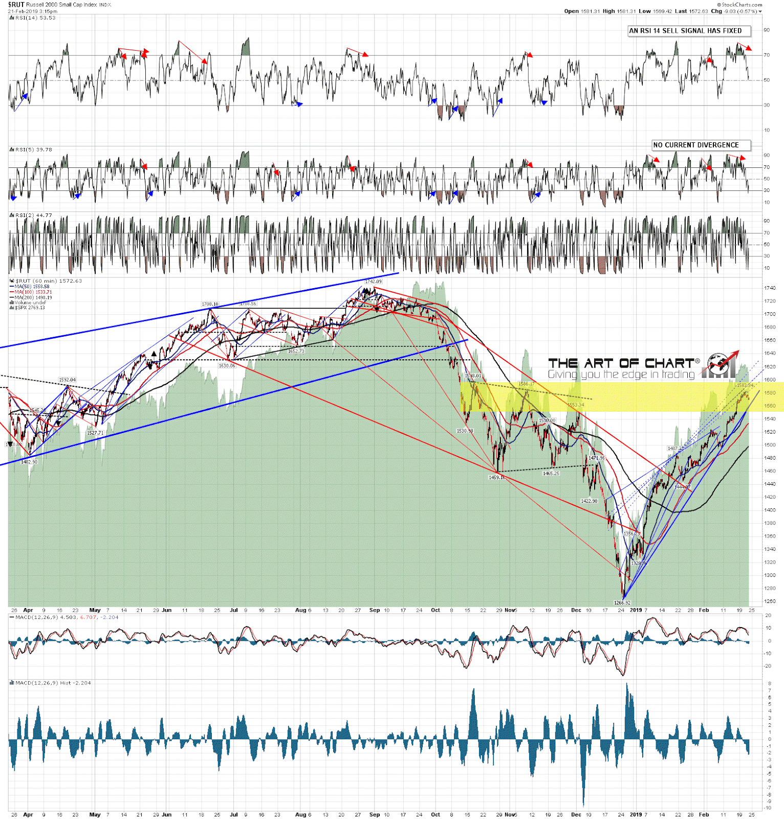 On RUT there is a 60min RSI 14 sell signal fixed and trendline support is not yet broken. That is now in the 1562 area.