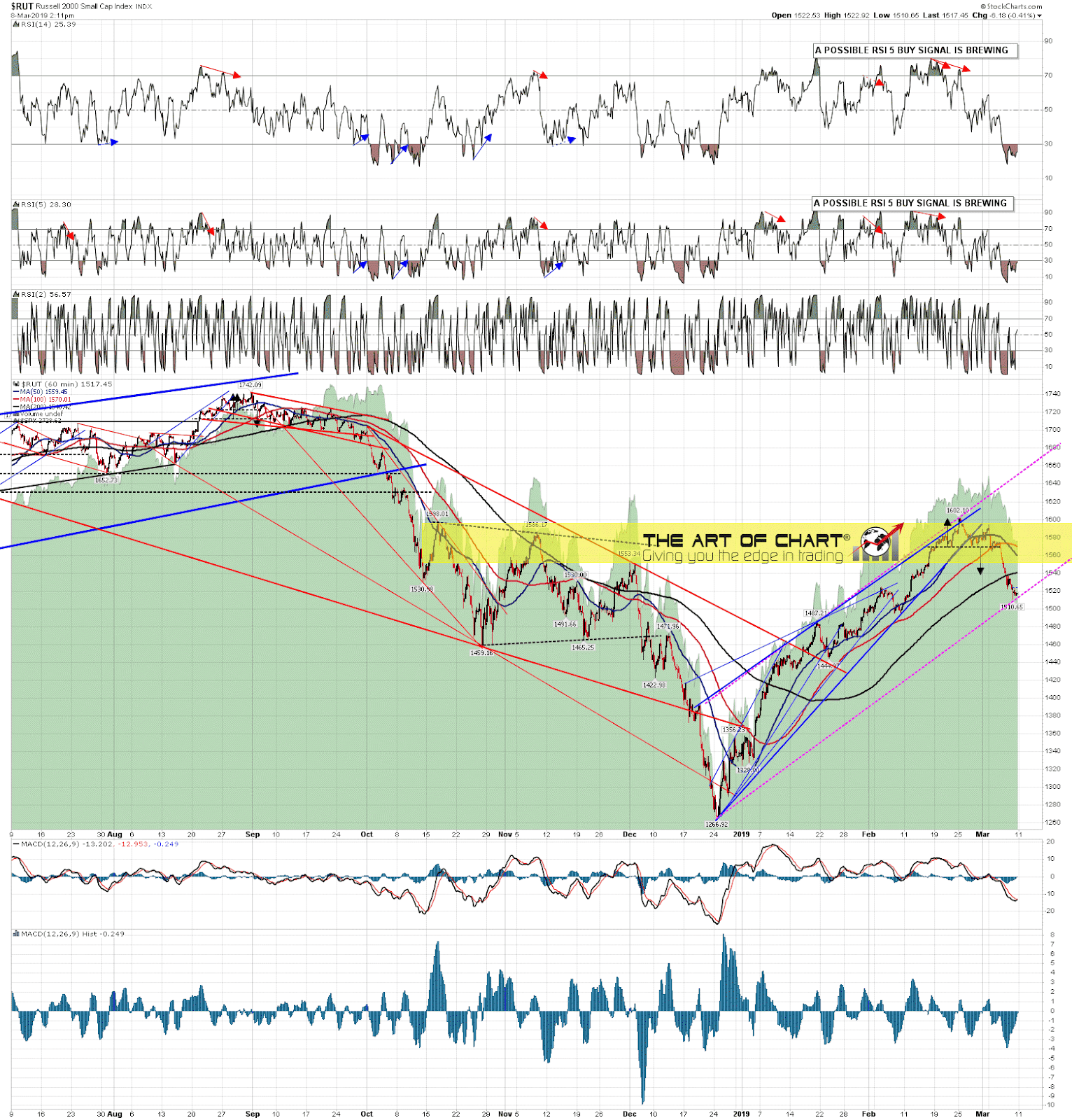 RUT has been leading the decline and may be leading on the rally as well. Worth noting that there are possible buy signals brewing on both RSI 14 and RSI 5, and that the current retracement low has established a decent quality rising channel that may be support on the next move up.