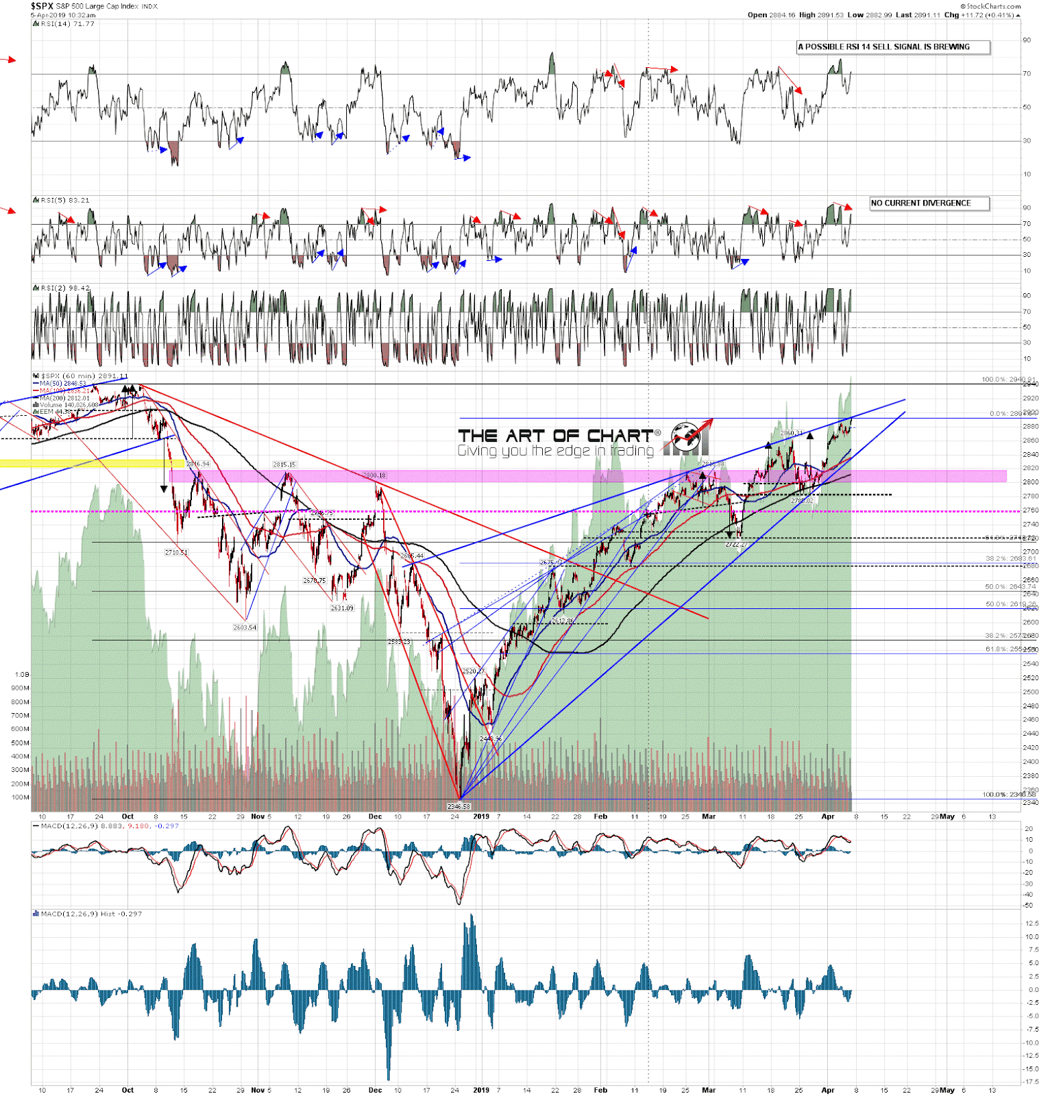 On Tuesday I was looking at the obvious resistance trendlines on SPX that might be hit this week in the 2885-2900 area and I’ve been watching those since. This morning they have been hit at 2891/2 with a possible hourly RSI 14 sell signal brewing, so this is an important inflection point and possible swing high area. I talked about that before the open this morning and this is the full version below of my premarket video also covering the usual wide array of future and forex instruments.