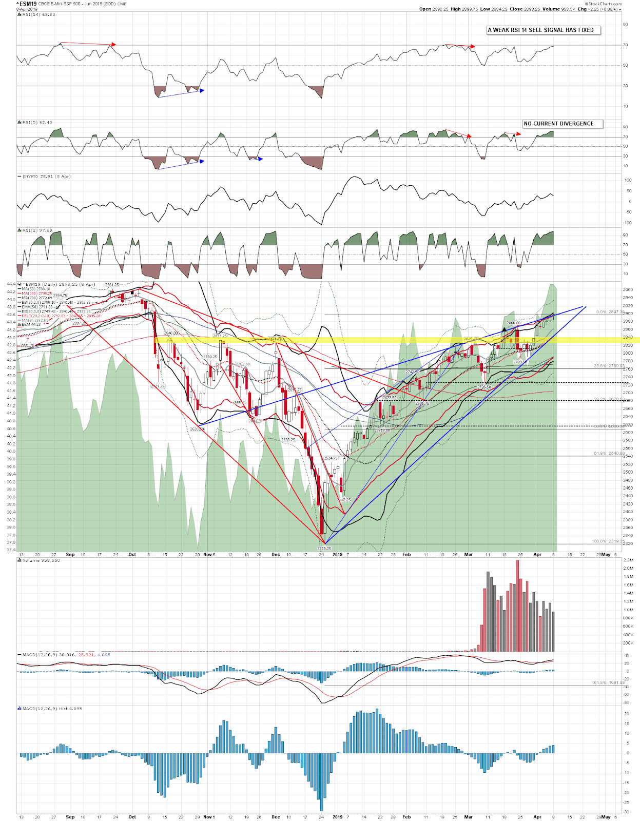 Having said that, I’d like to reflect on the full beauty of the trendline setup here. The strongest setups are a match on both SPX and ES and that is most definitely the case here. On ES the main rising wedge from the December low has overthrown slightly at this high. Wedge support is currently in the 2840 area. ES Jun daily chart: