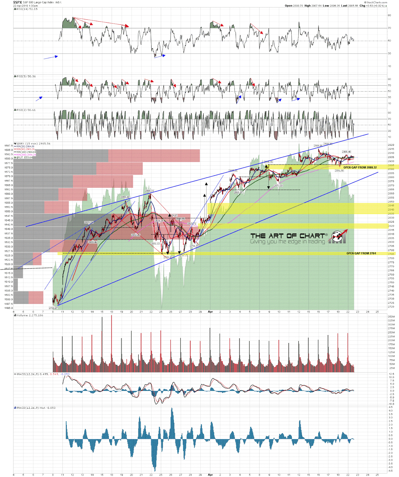 Just below that is the open breakaway gap from 2888.32, tested multiple times since the breakaway gap up on 12th April and holding so far. On a fill of that gap rising wedge support from the March low is now in the 2875 area. SPX 15min chart: