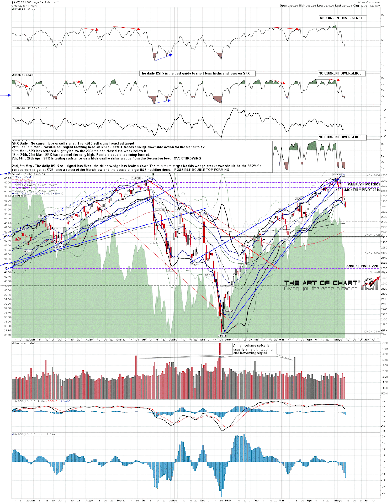 So where are we up to on the SPX daily chart? Well the short term H&S target at 2840 has been reached and the daily RSI 5 sell signal has reached target. The low today was just under the 3sd daily lower band, currently at 2839, and SPX has also currently broken below the 50dma now at 2859. If the B wave has now started then the rally should respect either 2900 or the monthly pivot at 2914. A break and conversion of the monthly pivot at 2914 to support at this stage might well finish this move early and deliver another all time high retest. After the Wave B rally we would ideally see a high latest Monday, down into the next cycle low to be made middle to end of next week.
