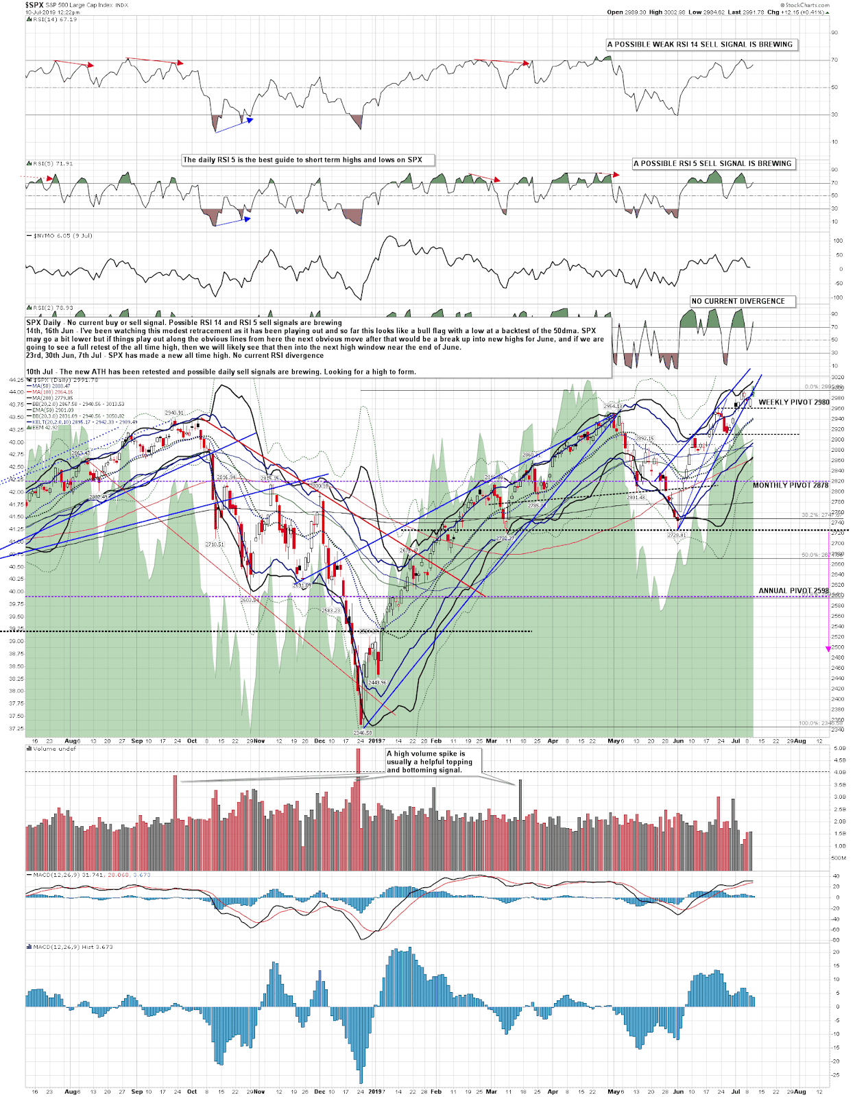 In my post last Friday I was talking about the likely retest coming of the new all time high on SPX (and ES), and how that should set possible daily RSI sell signals brewing on SPX (and ES). We saw that ATH retest and marginal new ATH this morning and I am now looking for a high. It is possible that SPX/ES might go a bit higher but I wouldn’t expect much higher and I’d note that there is already a decent quality double top setup here and that on a sustained break below 2964 the double top target would be in the 2923 area.