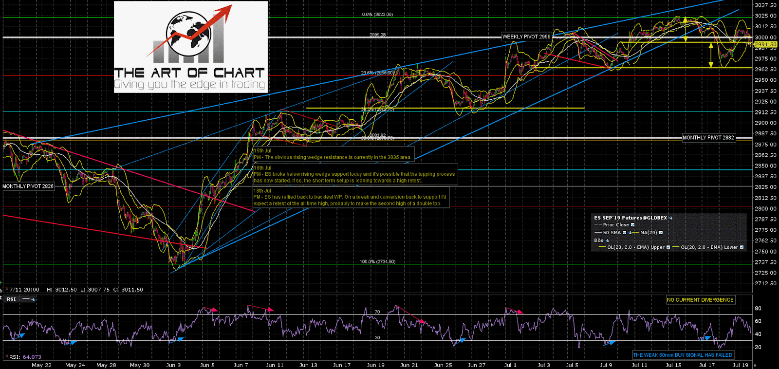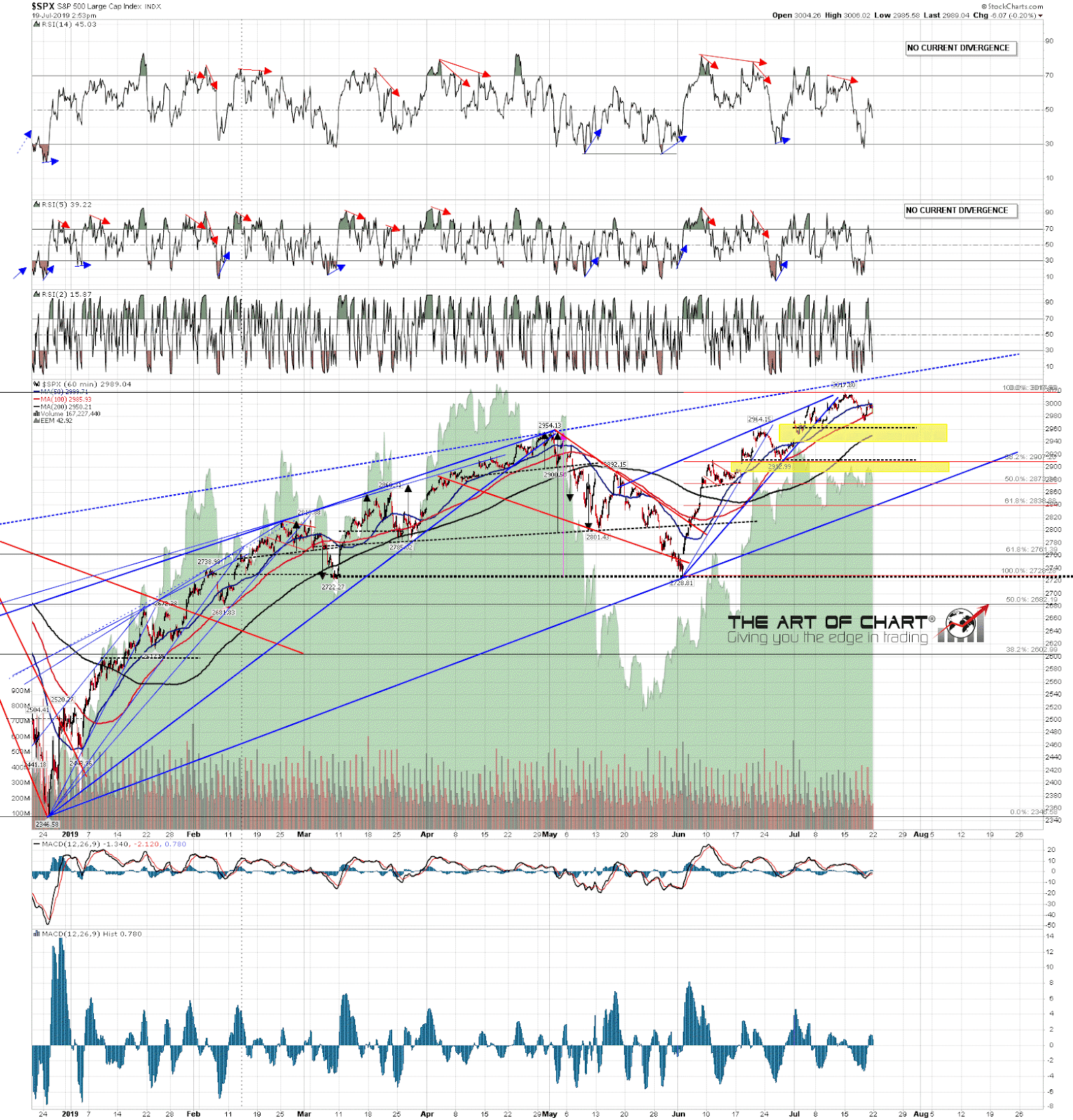 I was talking on our free public ‘favorite setups’ webinar last night about the importance of the 50 hour MA on SPX, and that was resistance on SPX at the high yesterday, and while that was broken slightly at the highs today, that was not converted back to support and has rejected late in the day. The obvious next target for me is another test of the daily middle band, now at 2973, and a likely break down towards the mid 2960 area and the possible H&S neckline support there.