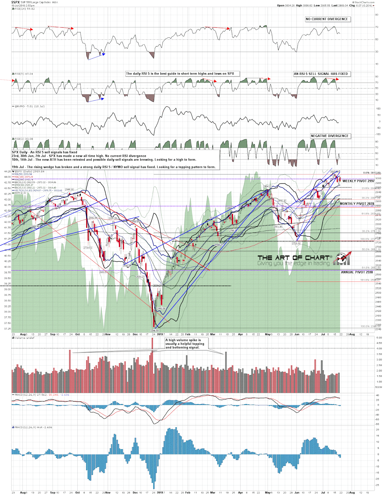 The daily RSI 5 / NYMO sell signal that was brewing last week has fixed on this first decline from the all time high and has not yet reached target. The rising wedge has broken down into a test of the daily middle band so far, and I am looking for a reversal pattern to form. The obvious options are either to retest the all time high to make the second high of a small double top or to head further down towards the 2964 area and the possible H&S neckline there.