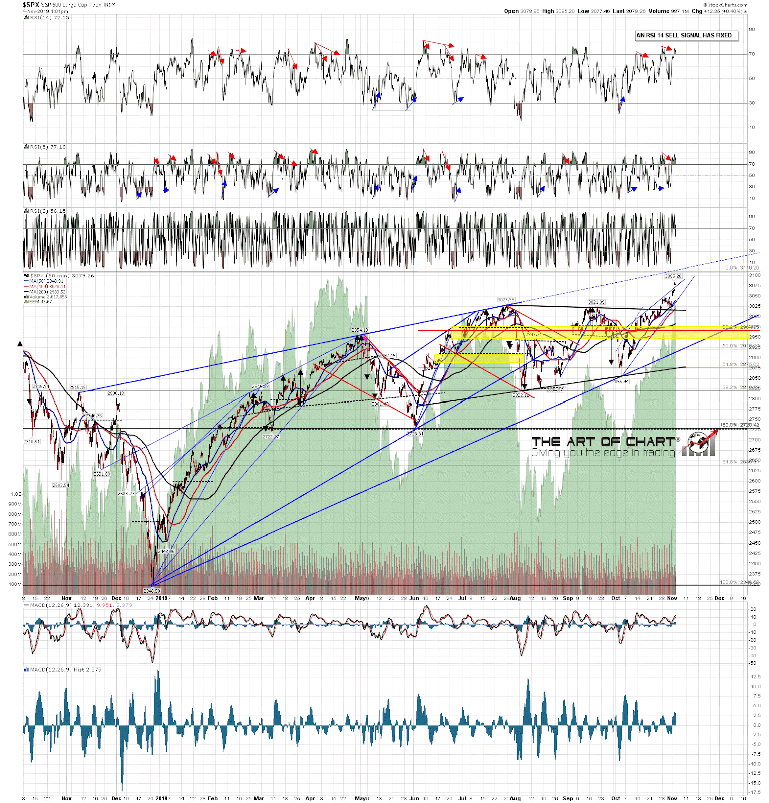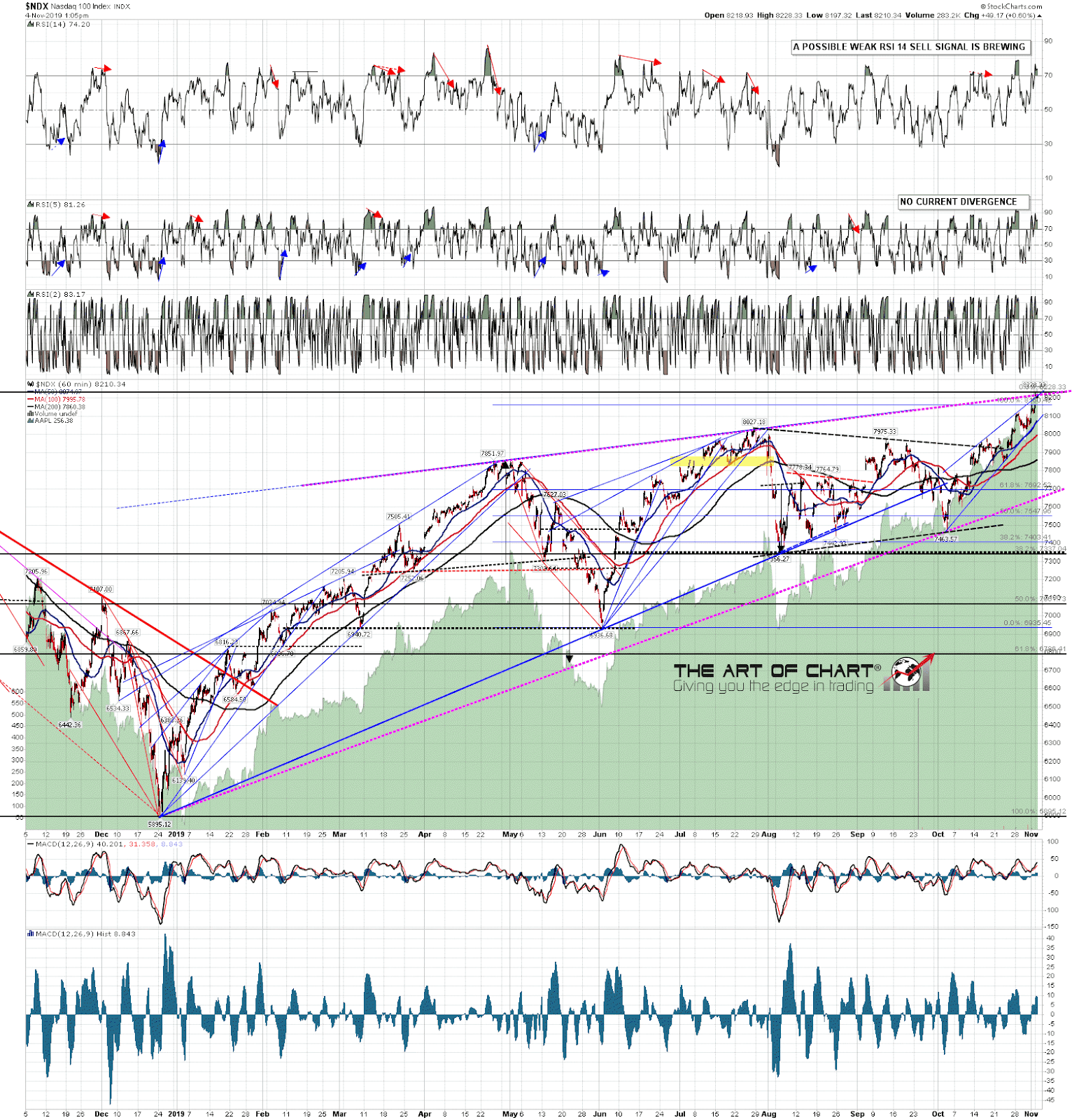 There is an obvious target for this move on NDX as well, and I was interested to see that was hit this morning. That could be the start of a bearish overthrow, or NDX could be expanding up into an alternate resistance trendline. What is obvious though is that at the close on Friday there was a lot of negative divergence on the hourly and daily charts and by the close tonight most or all of that divergence will have been lost. SPX and NDX may well have higher to go this week.