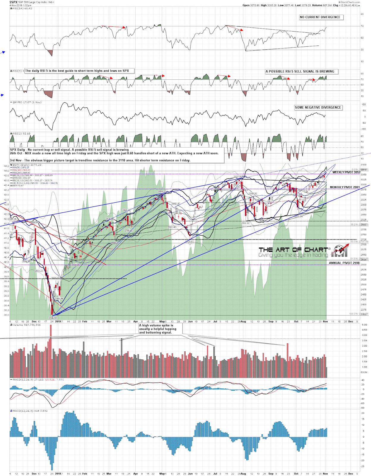 On SPX the initial rising wedge from the 2346 low is likely expanding into a larger rising wedge. Rising wedge support is now therefore in the 2915 area. The obvious overall target would then be the original rising wedge resistance, now in the 3110 area, and due to be in the 3130 area by the end of November. I would note the interesting fibonacci relationship here, in that if you take the move from the December low to the June low, and then add the same again to the June low, then the sum is 3111, which strengthens this area as a swing high target.