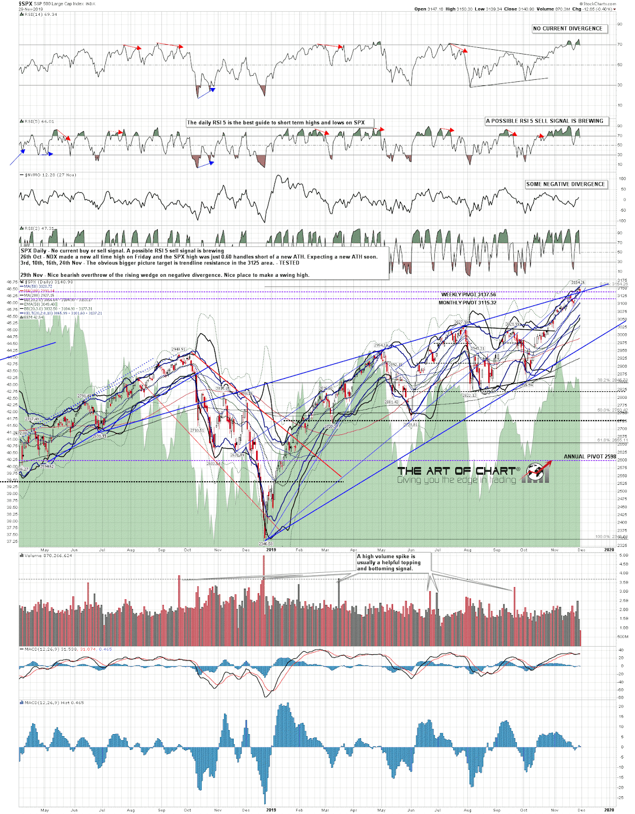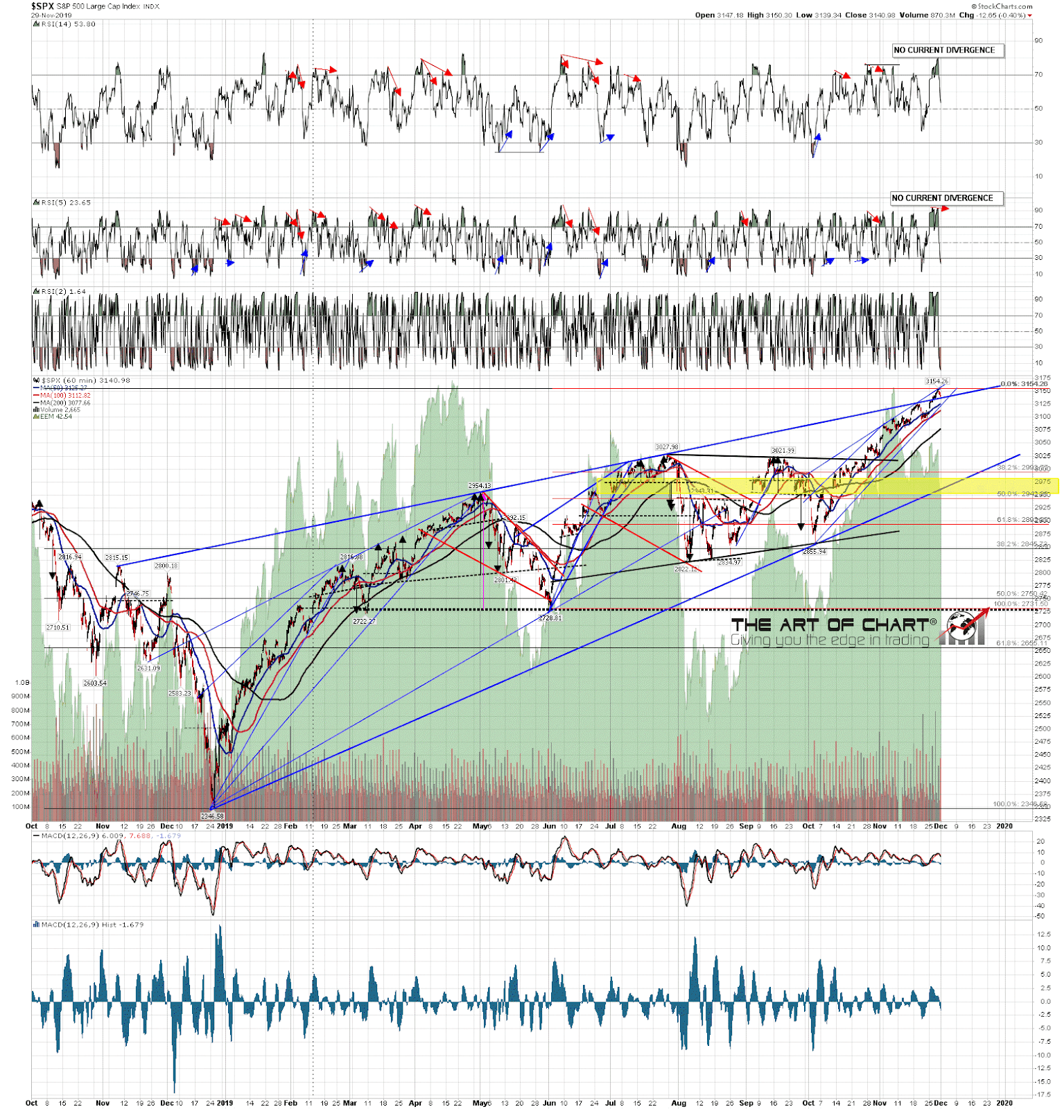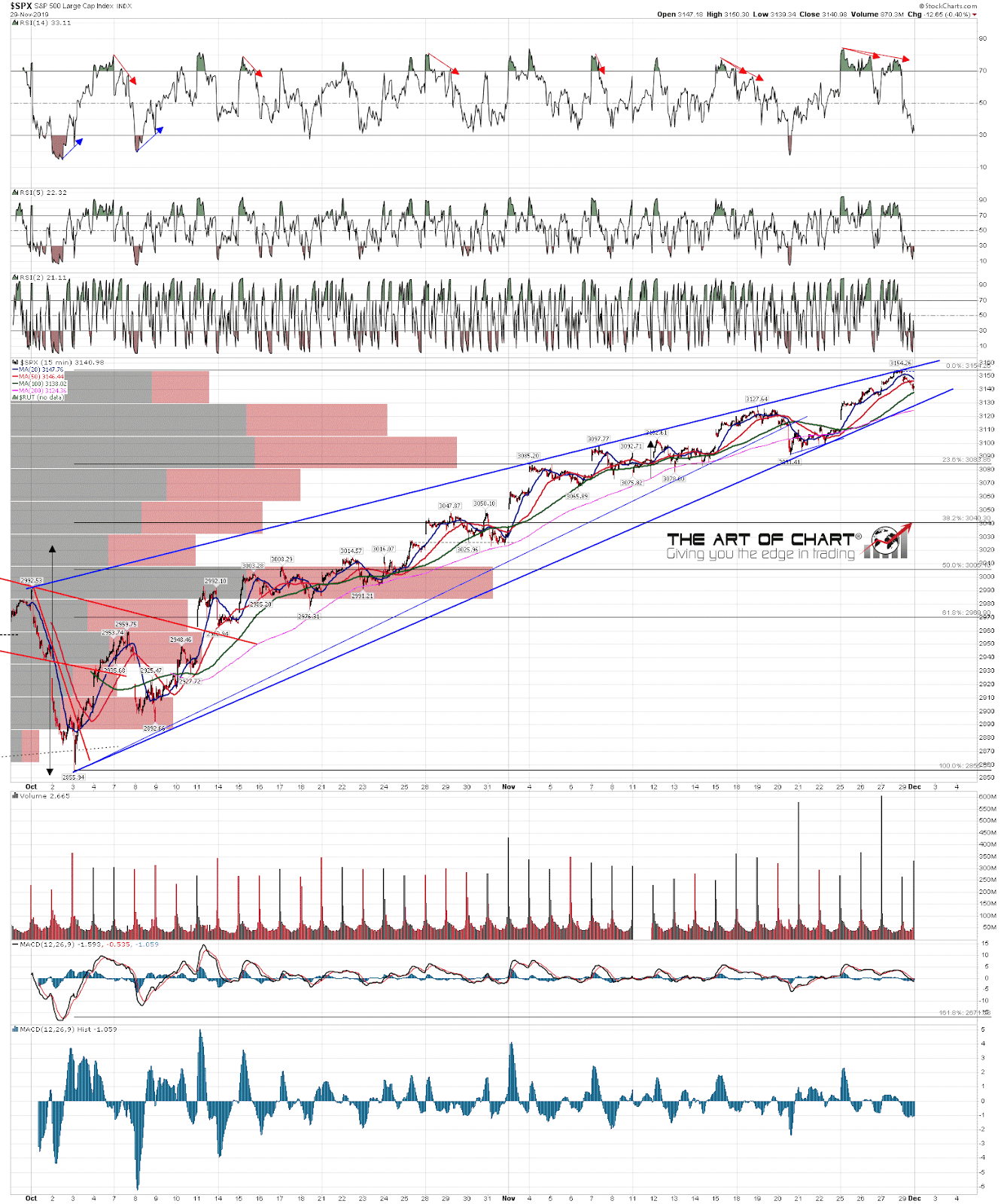 One thing I like to see in a candidate high is a rising wedge within a larger rising wedge, as these are frequently termination patterns. In this case there is a very nice smaller rising wedge from early October and wedge resistance was hit at the high last week. Possible H&S or double top options to go lower depending on the high tomorrow, and this shorter term rising wedge support is currently in the 3128 area.