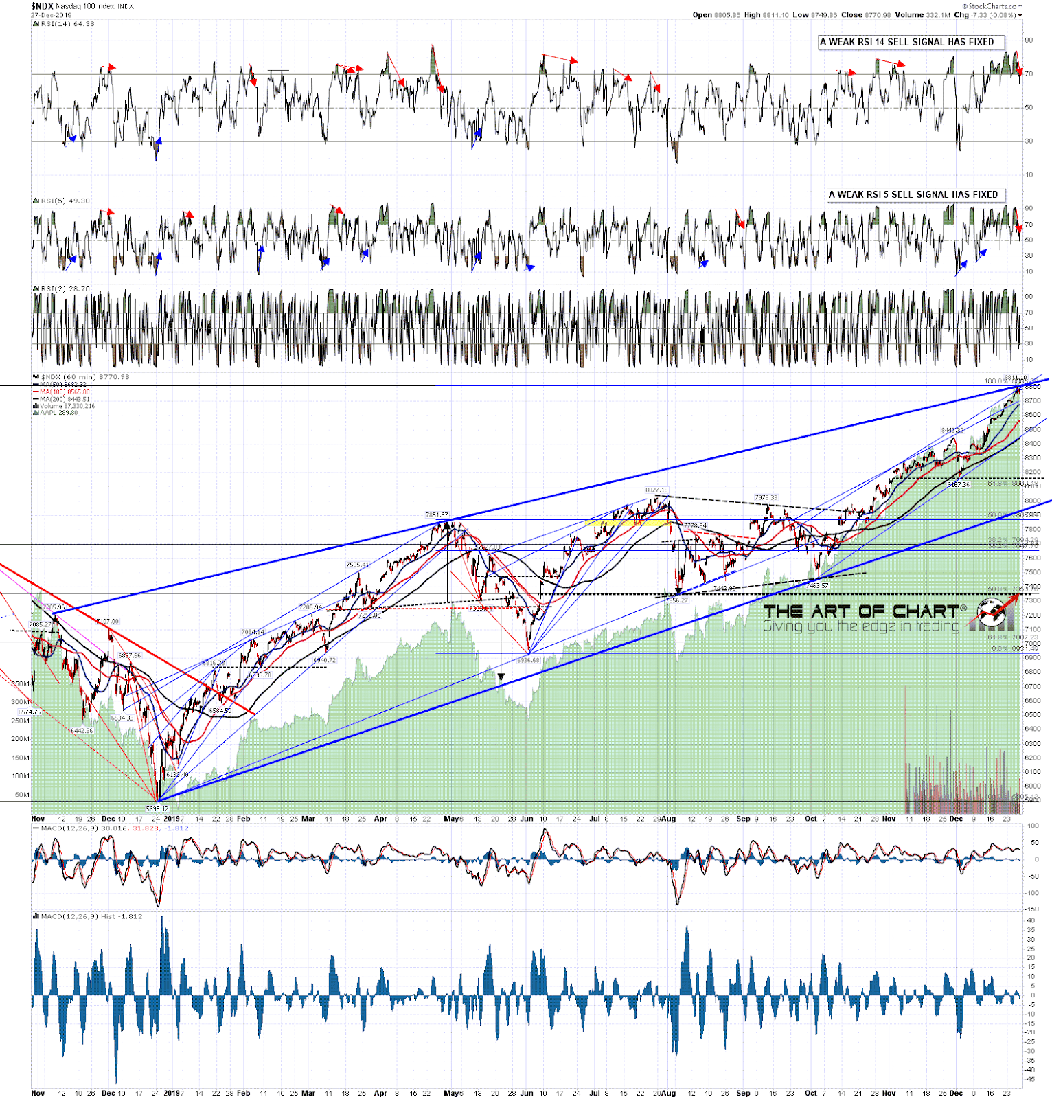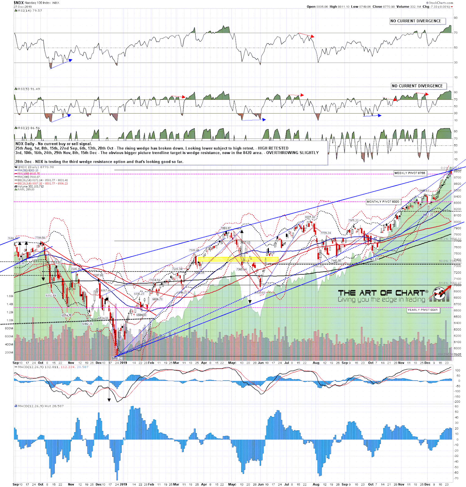 The holidays are ending and volume should be coming back into markets next week as players return. New Year’s Day on Wednesday is obviously a holiday as well, and the five trading days after that will be closely watched to deliver an indication of how the rest of 2020 might go. I’ll be looking at that stat closely later in this post but first I’ll review SPX and NDX and the position as traders return for the last two trading days of 2019. I would note again that the last trading day of the year is the only historically strongly bearish day in December, with SPX closing down 67% of the time, and Nasdaq down 15 of the last 19 years.