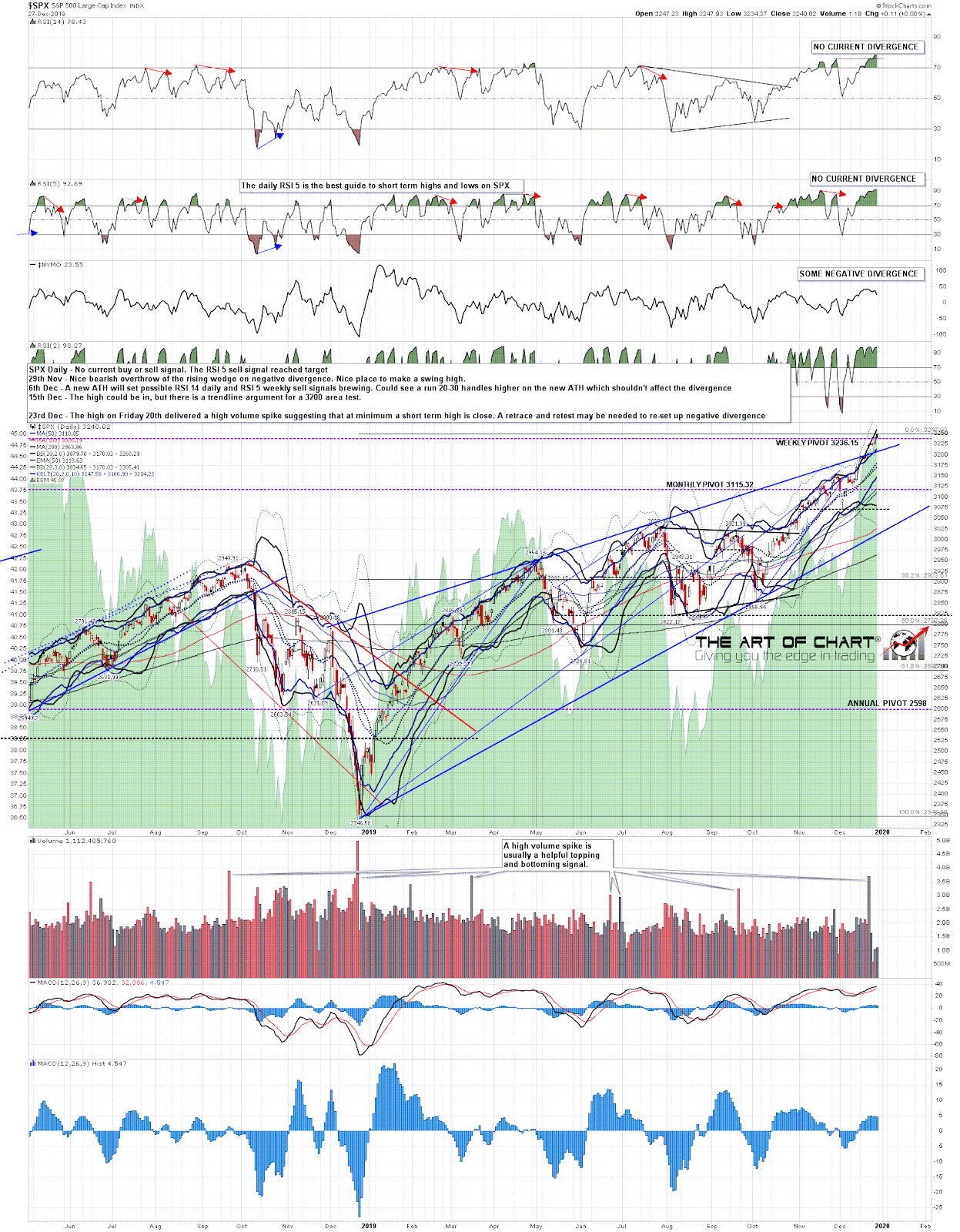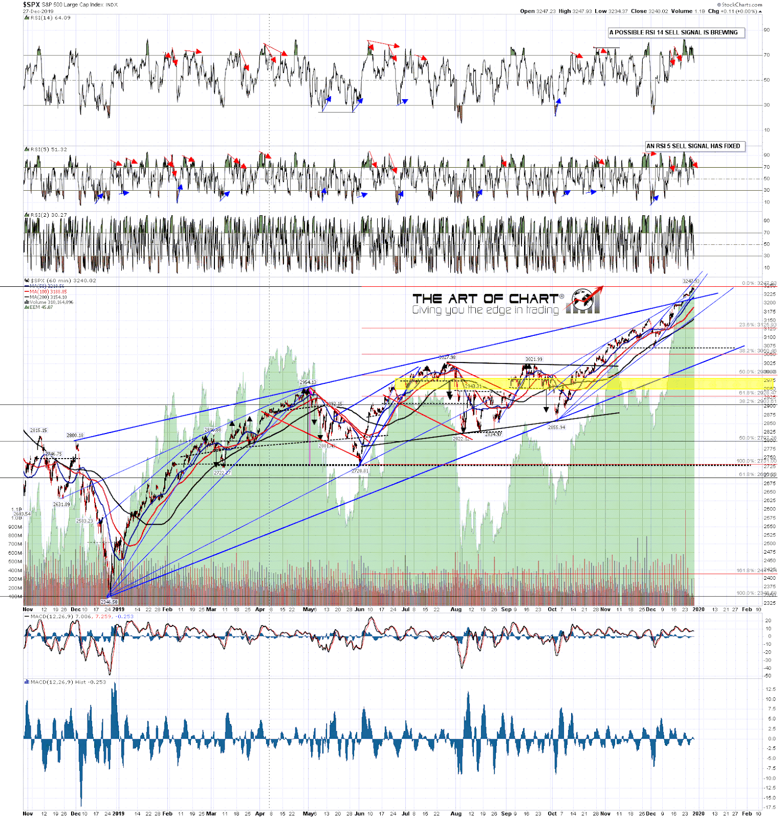 On the hourly chart SPX is testing support on the short term rising wedge from the 3070 low. An RSI 5 sell signal has fixed and an RSI 14 sell signal is brewing. On a break down I’d expect this setup to deliver a retest early next week of key short term trend support at the 50 hour MA, which closed Friday at 3218. From there ideally SPX would make a marginal new all time high and then fail into a larger move down.
