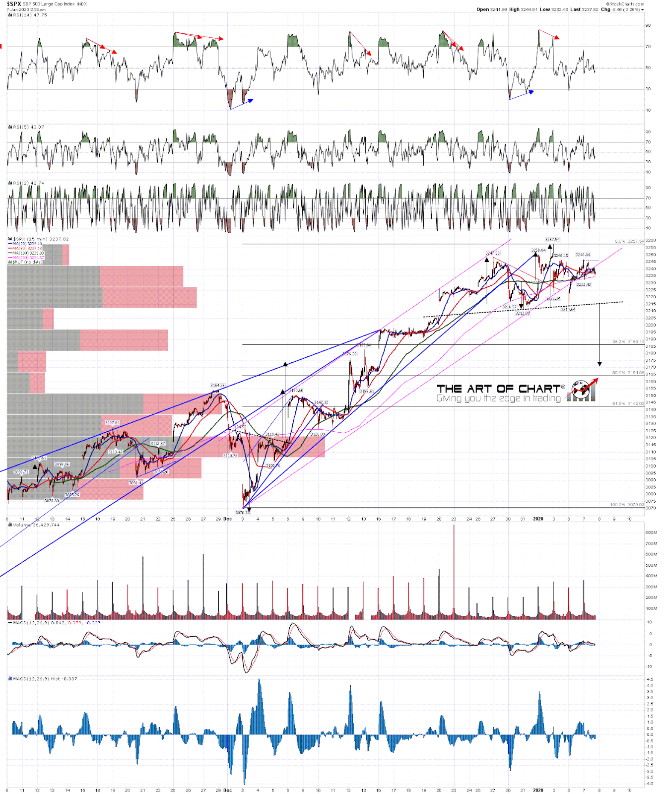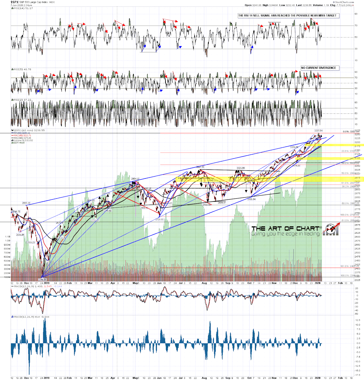 On the hourly chart the 60min RSI 14 sell signal hasn’t reached target yet and SPX has tested for the third time in three trading days the important short term trend support at the 50 hour MA, currently at 3235. On each of those days the close has been back over the MA. When that changes then the downside opens up.