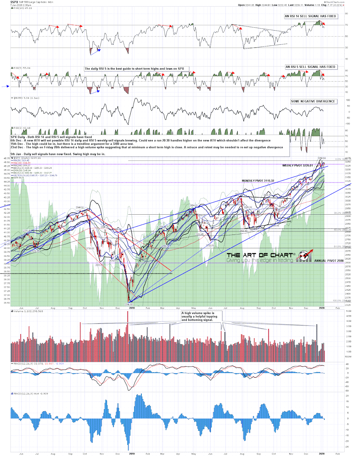 On the SPX daily chart both RSI 14 and RSI 5 sell signals have fixed and a topping setting is forming here that may take SPX down 100 handles or so into the 3160-70 area. As I’ve been explaining above, that target looks very credible. It may be that will be all we see for the time being though. We’ll see.