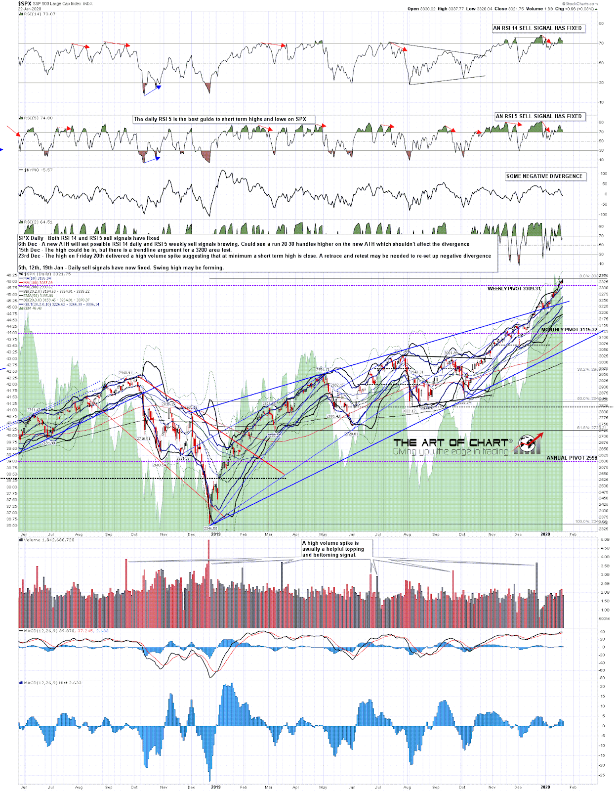 We’ll see how that goes tomorrow but whichever way that break goes may well deliver the market direction for the rest of January, which is important as the January Barometer statistic I’ve been looking at actually delivers pretty well. I’ll be writing this up in detail in my next post at the weekend but the bottom line is that if January closes green, over the 2019 close at 3230.78, then the odds of SPX closing 2020 higher than that January close are about 87%, up from an average probability of an annual green close of about 73%. If January closes red, under the 2019 close at 3230.78, then the odds of a 2020 close lower than that January close are about 41%, up 50% from an average probability of an annual red close of 27%.