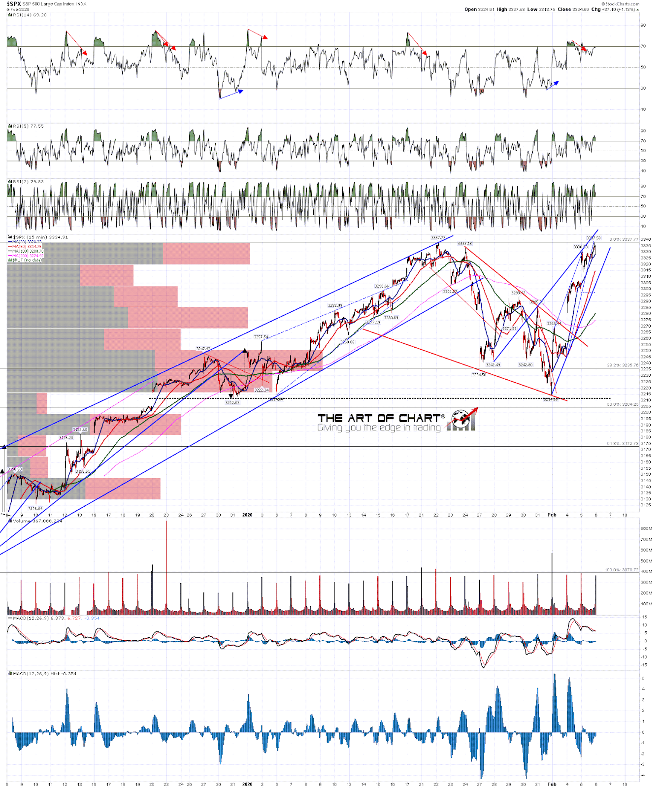 On the SPX 15min chart my channel resistance trendline was broken by the gap up this morning, and that has expanded into an even nicer rising wedge resistance trendline. If that survives tonight, unlike yesterday’s resistance trendline, then then the obvious next move would be a test of the rising support trendline from Friday’s low, which closed today in the 3305 area and is rising at about four handles per hour in regular trading hours. If that wedge support breaks then this move might be over, though I don’t think that any SPX high here that failed to make a new all time high would last long. I can’t recall any instances offhand from the last decade at least of a high on SPX lasting more than a couple of weeks where ES had made a new all time high and SPX had not.