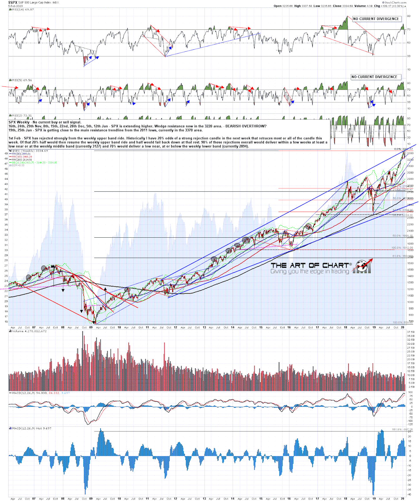 As it is likely after today’s gap up and go that we are looking at a reversal candle this week, that puts the historical odds from the last ten years at about even between continuation up to resume the broken weekly upper band ride or resumption of last week’s downtrend in the near future. For reference that would involve at least a near miss of the weekly upper band soon and that is currently in the 3385 area. A hit there in the next week or two could deliver a continuation of the strong uptrend over the last few months though I’m doubtful about that. I think the odds favor a resumption of last week’s downtrend after this spike up has blown out, though likely we will need to see a new all time high on SPX before that, which was missed by 0.19 handles at the high today, though a new all time high was made on ES after the RTH close.