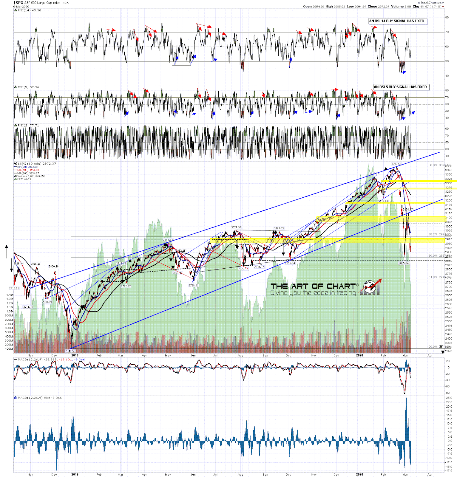 On the daily chart the daily sell signals have made target of course and, as and when stockcharts is back up, there may now be daily positive divergence, but I’d be pretty surprised to see a major reversal directly back up from here.