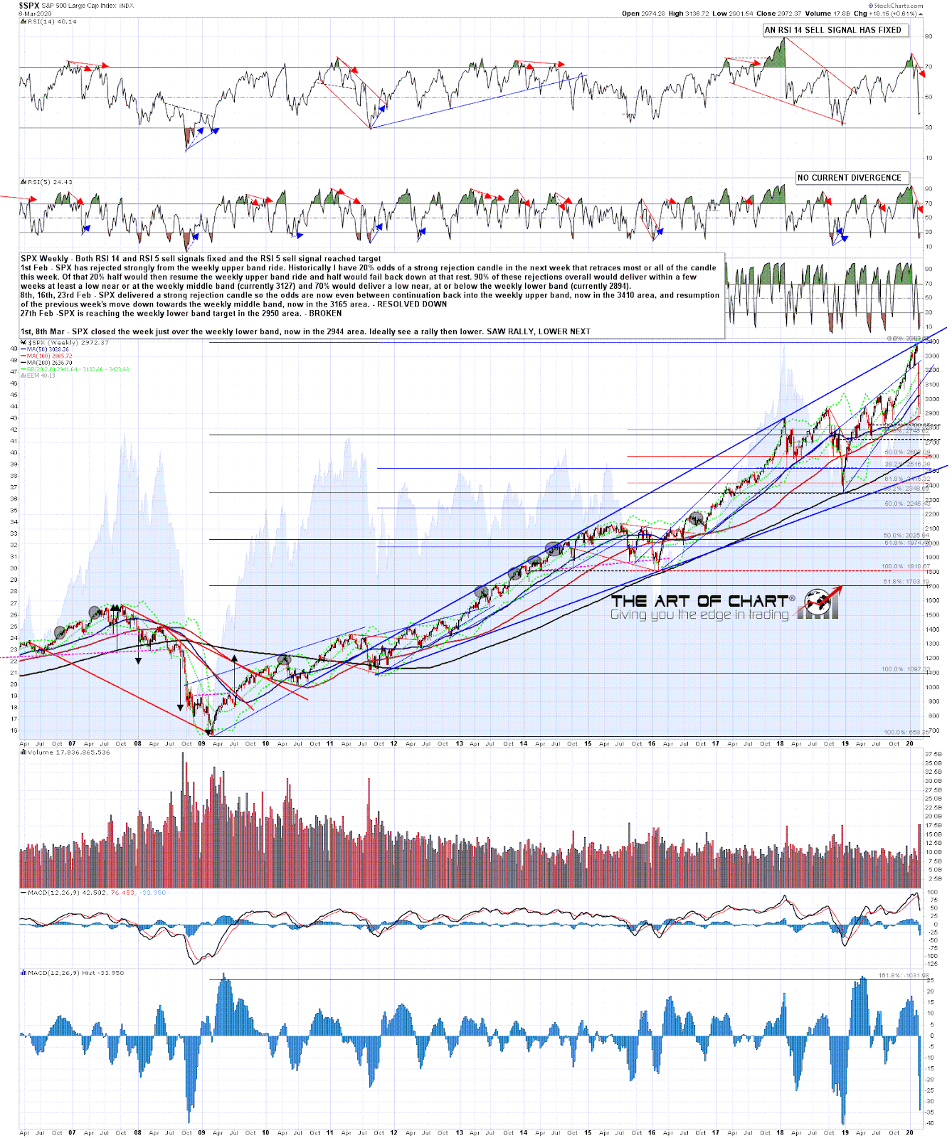 One question I was asked in my premarket video this morning was how much impact the Fed could expect to have in this news environment. Well they have already given us the rally high on SPX on the brief spike on the 0.5% rate cut last week. That didn’t last long and as I recall from 2008/9, he impact the Fed was having in a very strong news environment was at best delayed for any sustained reaction. I don’t think even a full percentage point cut at this stage would do more than rally the tape for a day or two, and perhaps not even that.