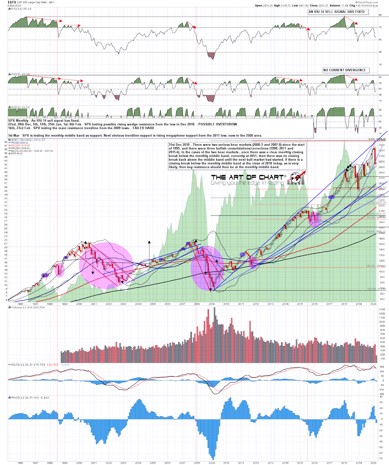 In my last post on 28th February I was talking about the big rally that we should see on SPX and noted the two obvious bounce levels for that rally at the possible H&S necklines at 2856 and 2822. The low was at 2855, a whisker under that first level and the 50% retracement rally that followed was a somewhat high but still perfectly acceptable H&S right shoulder. That H&S has broken down at the open today of course, with a target at a full retracement back to the Dec 2018 low at 2346.58. If seen that would be below the rising megaphone support from the 2011 low currently in the 2500 area, and would be a decent match with rising support from the 2009 low. I’ve marked up the H&S below.