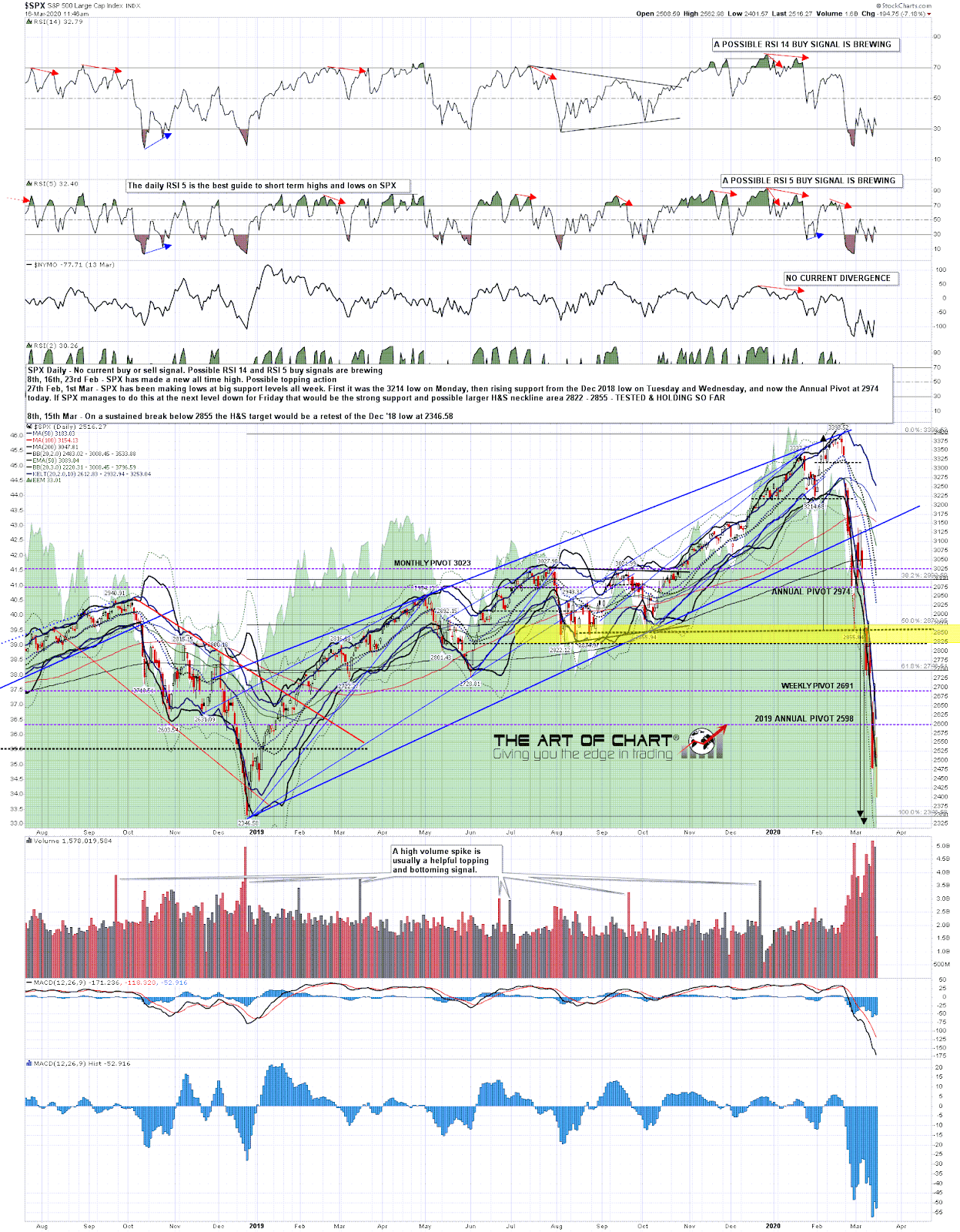 In the meantime markets are still looking pretty interesting. In my post last Thursday I was noting at the end that with the support trendline at 2500 broken, then the obvious target was the big level in the 2350 area, with the H&S target and the December 2018 low both at 2346 and the rising support trendline from the 2009 low in the same area. That is a very big level which we kinda hit in the first hour this morning. It was an interesting journey to get there that says something about the kind of violent but still technical markets we are seeing here at the moment.