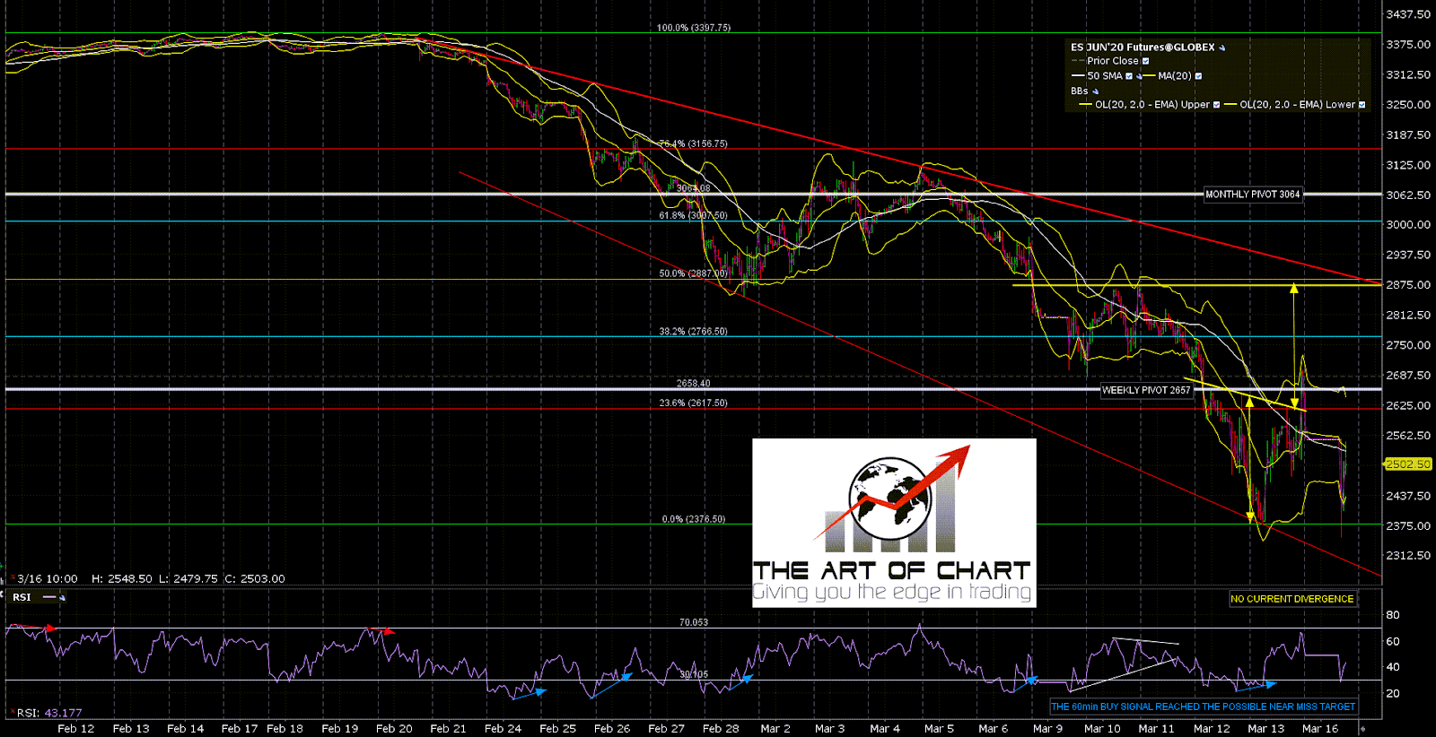 In my premarket video for subscribers at theartofchart.net on Friday morning, which you can see here, I was saying that the obvious path for Friday on ES (March) was first a test of the 2630 area or a bit higher (AM high was 2635 area), then a decline (more likely) to retest the overnight low at 2392 and maybe test the 2350 support area or (less likely) find support in the 2490-2500 area, making the right shoulder on an IHS that could then break up towards a higher target in the 2850-2950 area. Obviously the low was in the 2490 area and ES then broke up from that IHS with a target in the 2885 area.