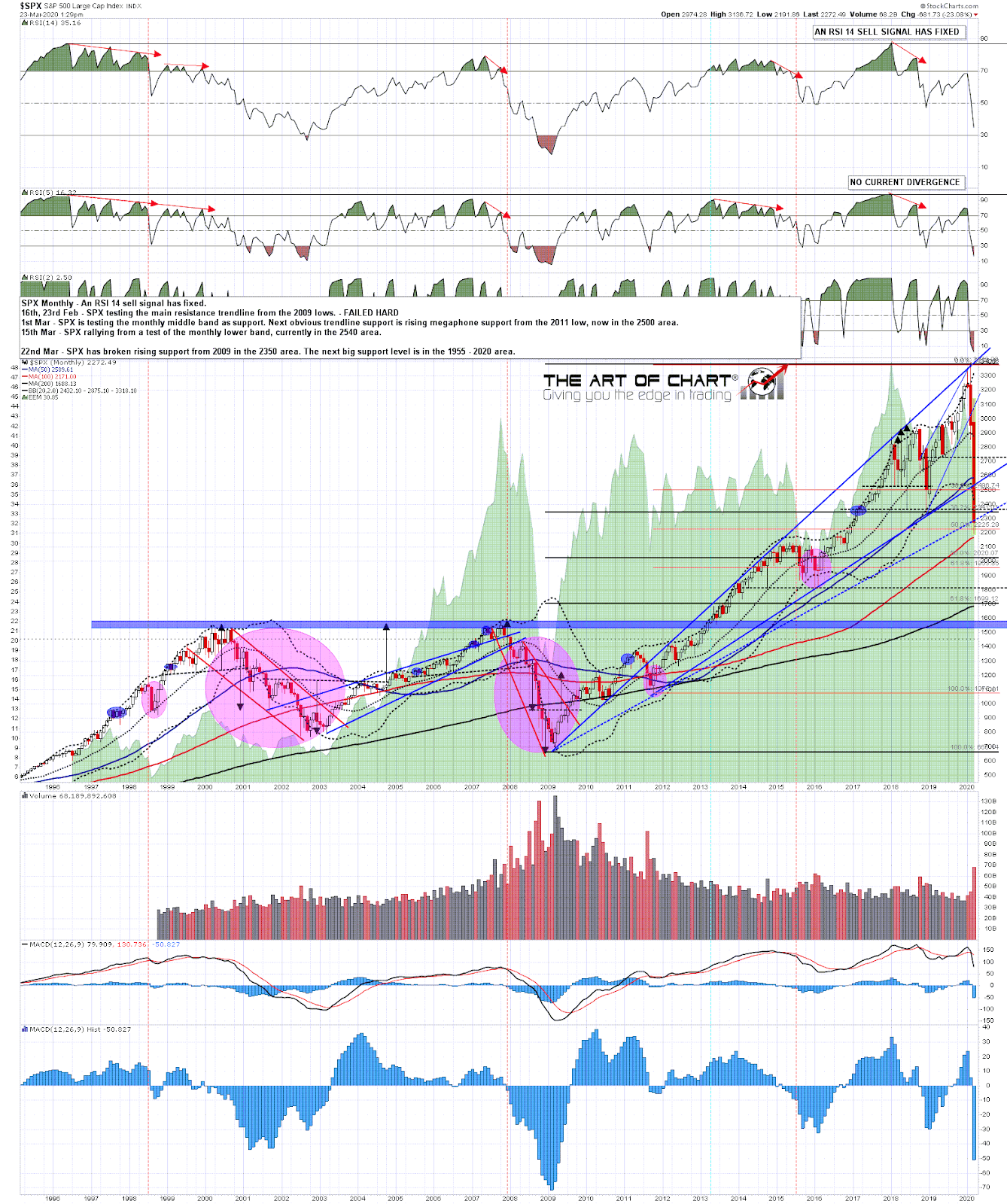 In the event that a larger economic contraction was to be triggered, then that could open lower targets on SPX. I’d note that the 1936-42 bear market delivered slightly over a 76.4% fibonacci retracement, and the 1929-32 bear market managed to deliver an absolute decline of 86%. It is possible to go lower than the targets I have given above in really extreme circumstances, and I am assuming that governments will act to prevent those circumstances. I’m expecting to be right about that but I could of course be wrong. We’ll see.
