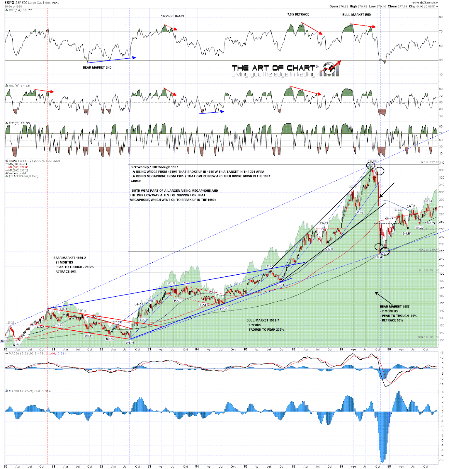 The first famous crash I’ll look at is the 1987 crash on SPX. This has something strongly in common with the current decline in that it happened very quickly. There had also been a strong bull run into the decline, up over 200% in 5 years. What I would note though is that, despite the shocking stories about the panic and wild decline, the decline was an almost perfect 50% retracement of that bull run, after which SPX bottomed out and started the next move up. My view is that the 1987 was just a retracement that happened alarmingly fast.