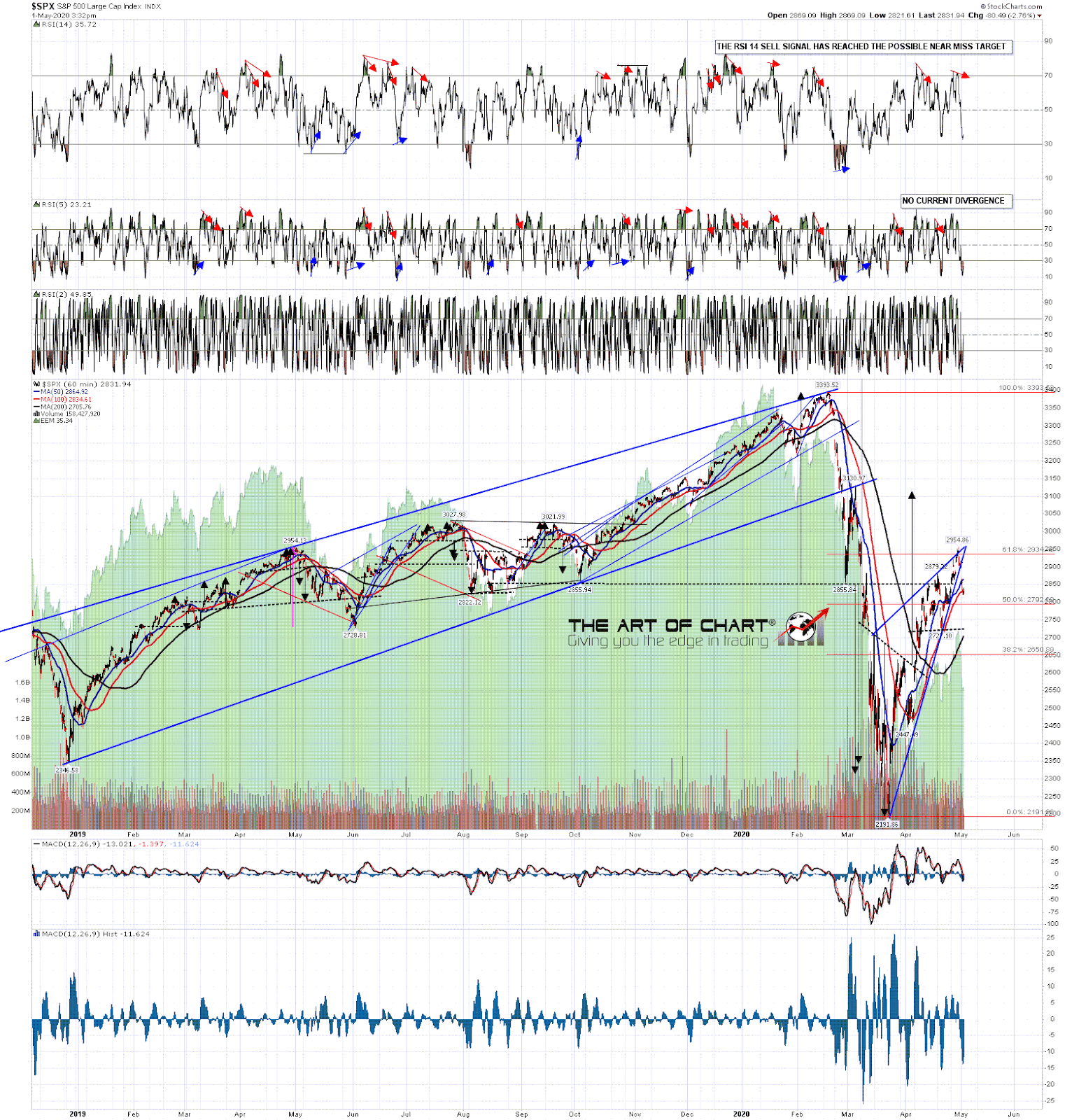 An hourly RSI 14 sell signal fixed after the high this week and has reached the possible near miss target. The hourly 50 MA was broken this morning and if we do see a rally back to the 2860 area on Monday, would add to the already impressive resistance there.