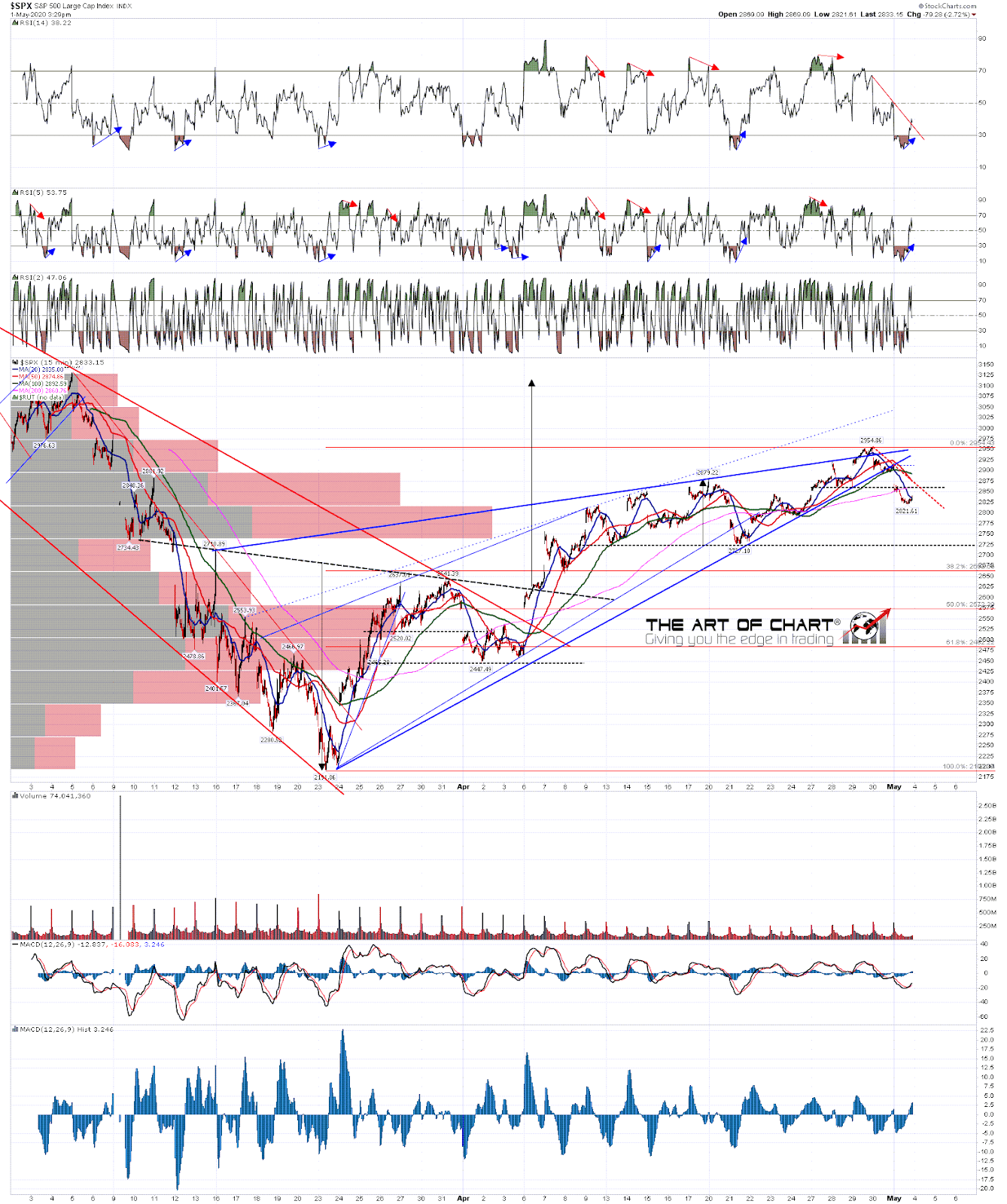 On the 15min chart the rising wedge has obviously broken down and fell directly though the 2860 area I thought might deliver a right shoulder rally for an H&S. Looking at the chart that area might well be resistance for a rally on Monday, if we see one. The next really big level support on the SPX chart is the much larger possible H&S neckline in the 2727 area.