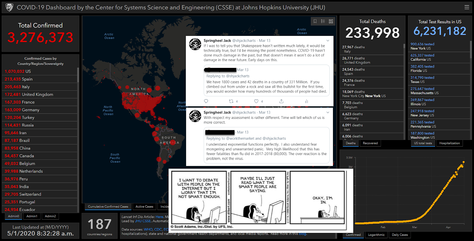 It’s been an exciting week, with wild moves, bold pronouncements about markets, terrible economic news, expectations about interventions by governments, the number of US confirmed cases of COVID-19 climbing over a million, deaths from COVID-19 in the US climbing over 60,000 and over 235,000 worldwide. Exhausting and TGIF.