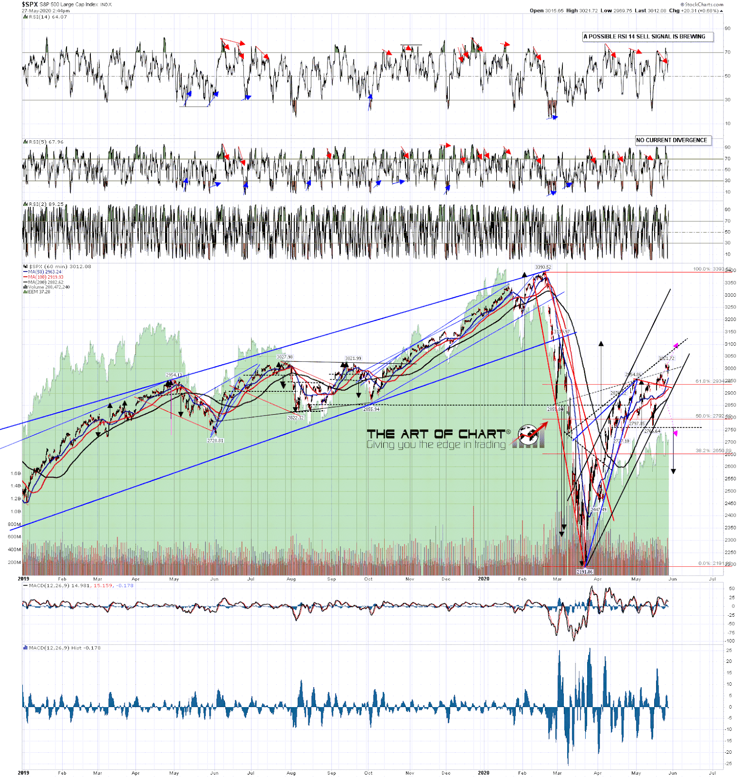 SPX gapped up over 3000 this week and has been sustaining trade above it, with retracements. My working assumption is that SPX is on a path to reach my 3100 target area. So how is that looking on the SPX hourly chart?