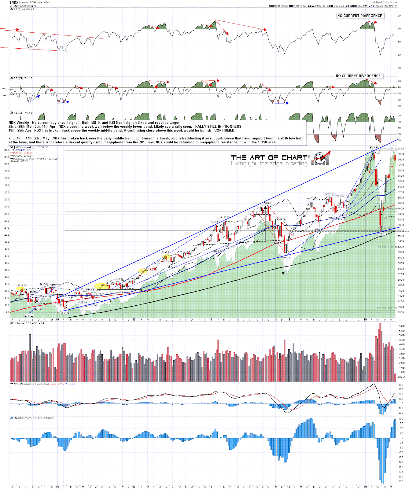 On the daily chart main support is at the daily middle band, also now in the 2900 area. I’ve drawn in the possible wedge resistance area that I’m looking at and ideally I’d be looking for daily RSI 5 and NYMO negative divergence to have formed by the time that 3100 target area is hit.