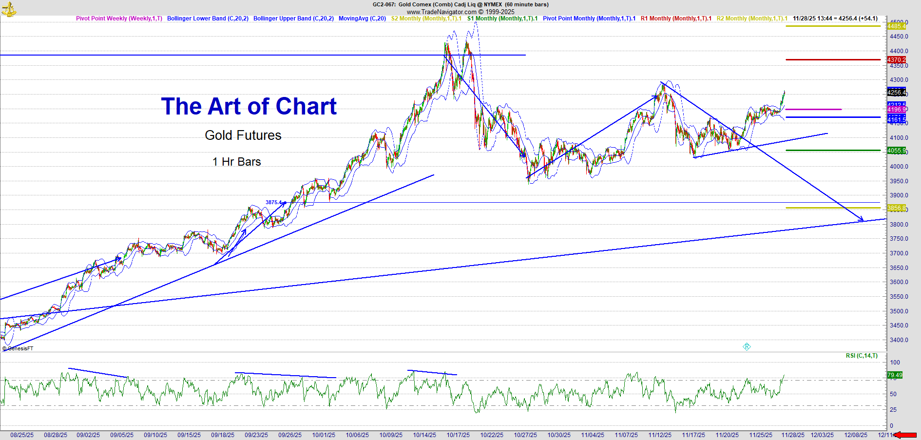 Gold: About $4,220/oz, hovering near record highs as markets price in a high probability of a Fed cut in December and continue to hedge fiscal/geopolitical risk.